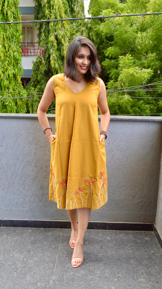 Mustard Silk Circular Dress with Hand Embroidered Jacket