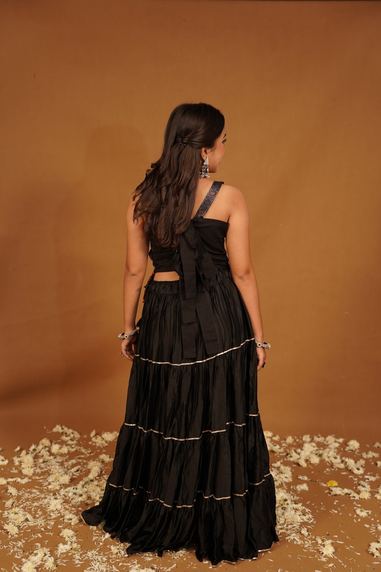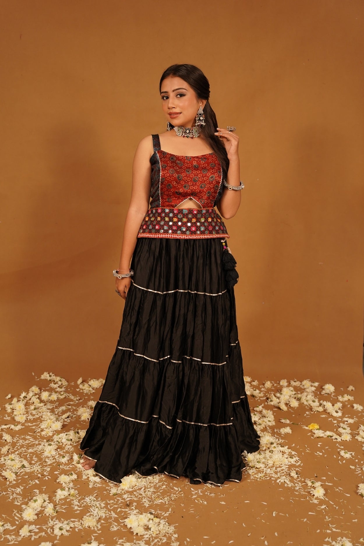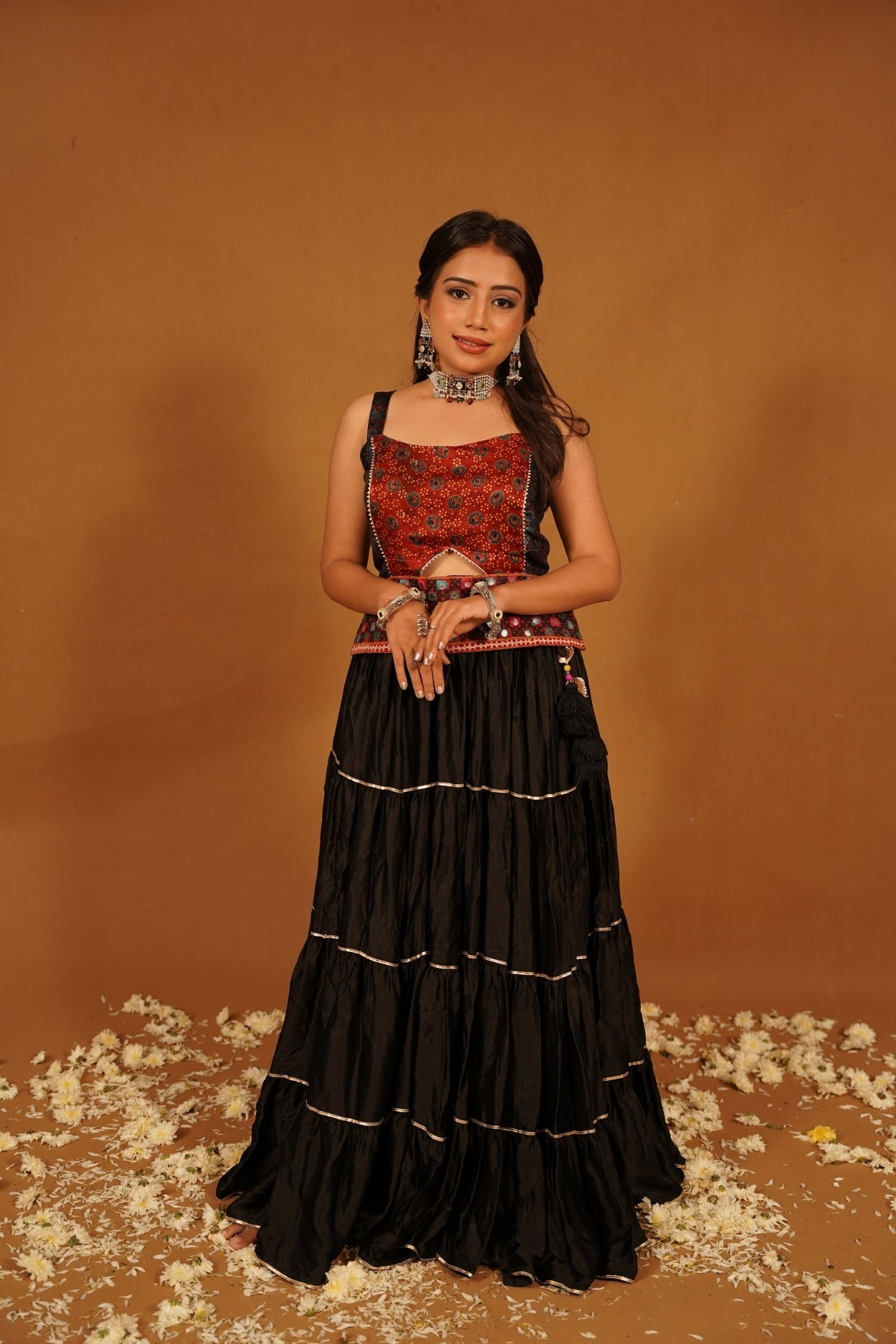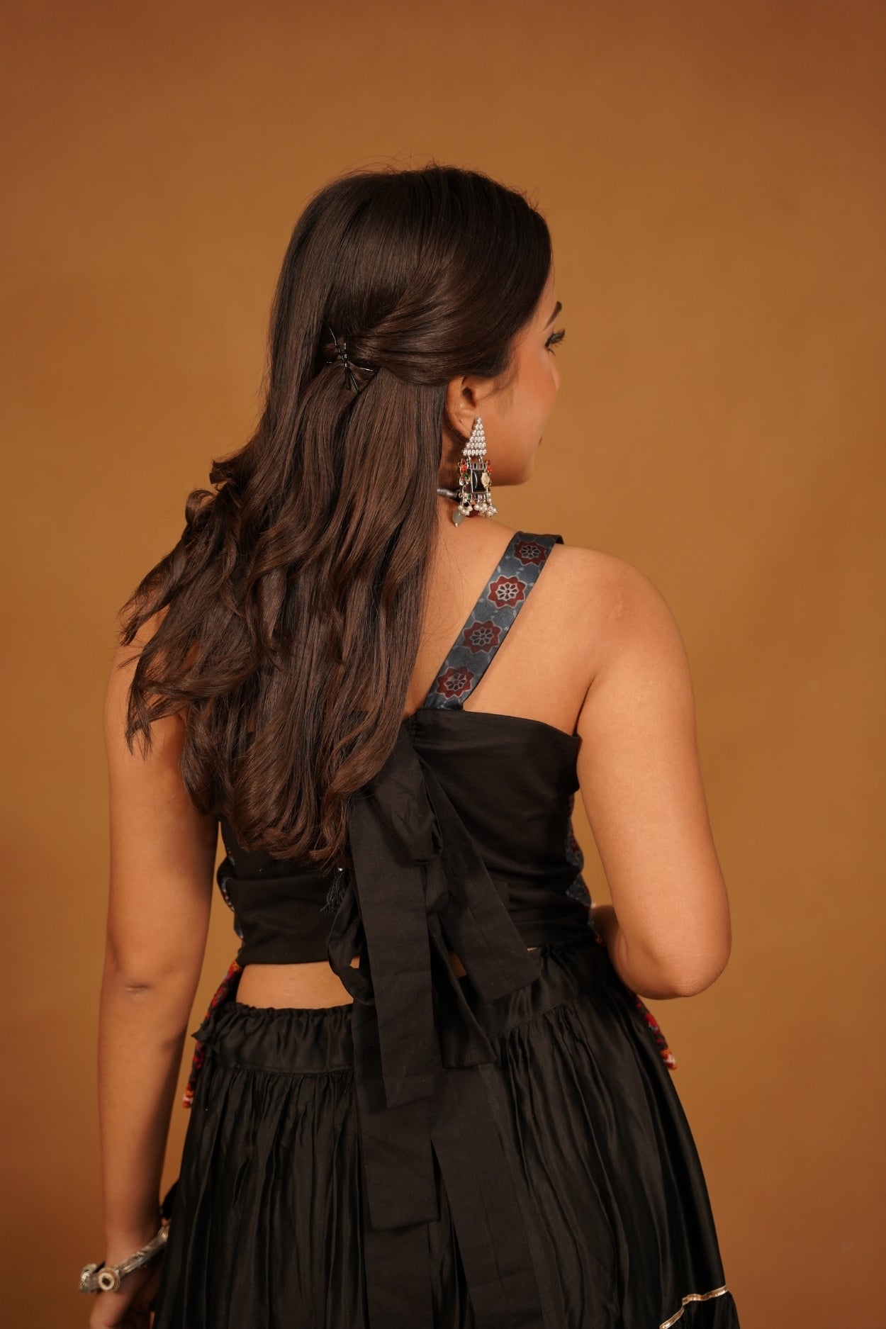 "Elevate your wardrobe with this exquisite black sleeveless Ajrakh traditional top, a stunning piece that seamlessly blends heritage craftsmanship with contemporary style. Crafted from soft, breathable fabric, this top showcases the intricate Ajrakh block printing technique, renowned for its vibrant patterns and deep colors. The rich black base serves as a striking canvas, beautifully highlighting the detailed motifs that embody the artistry of traditional artisans.