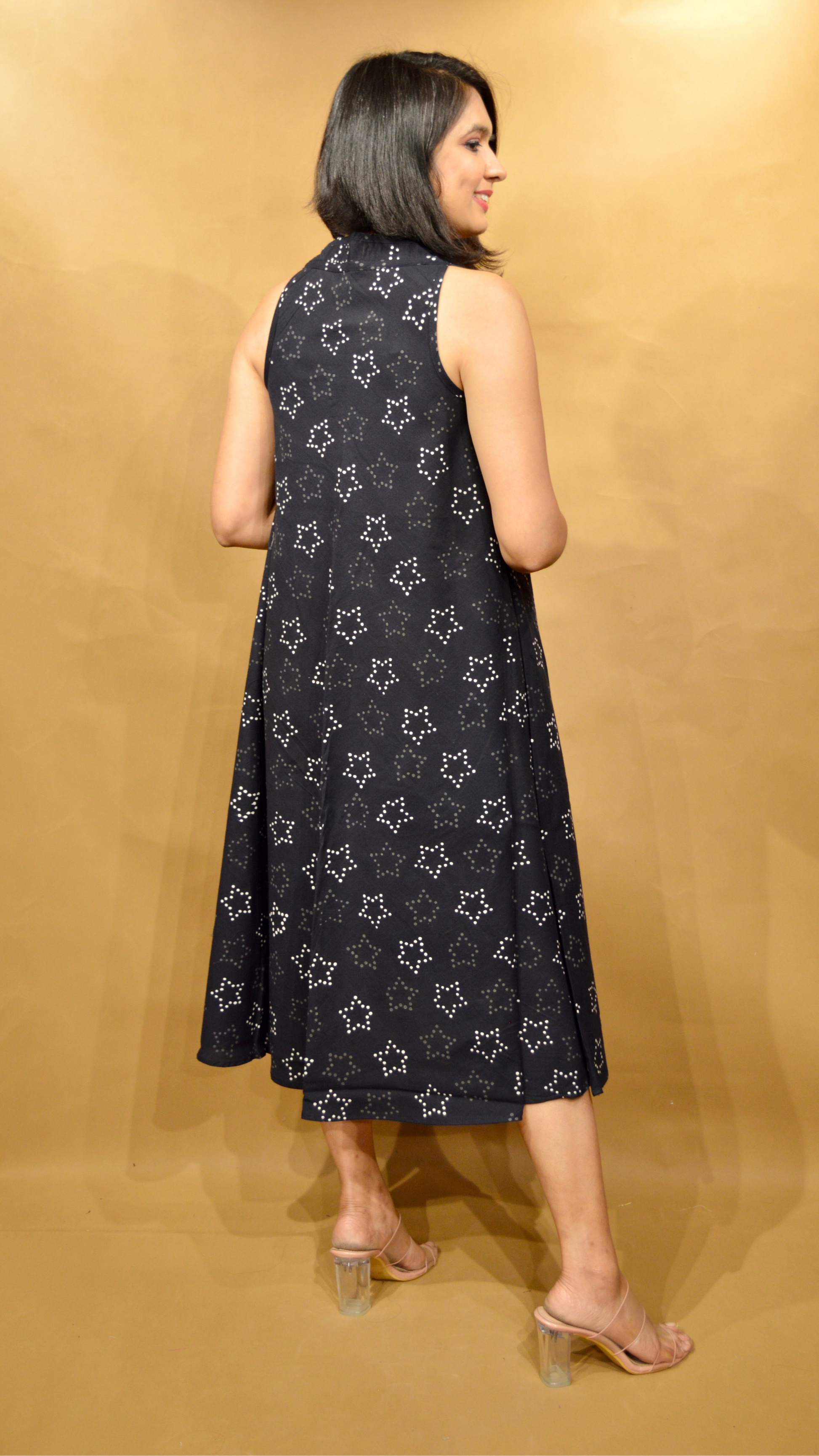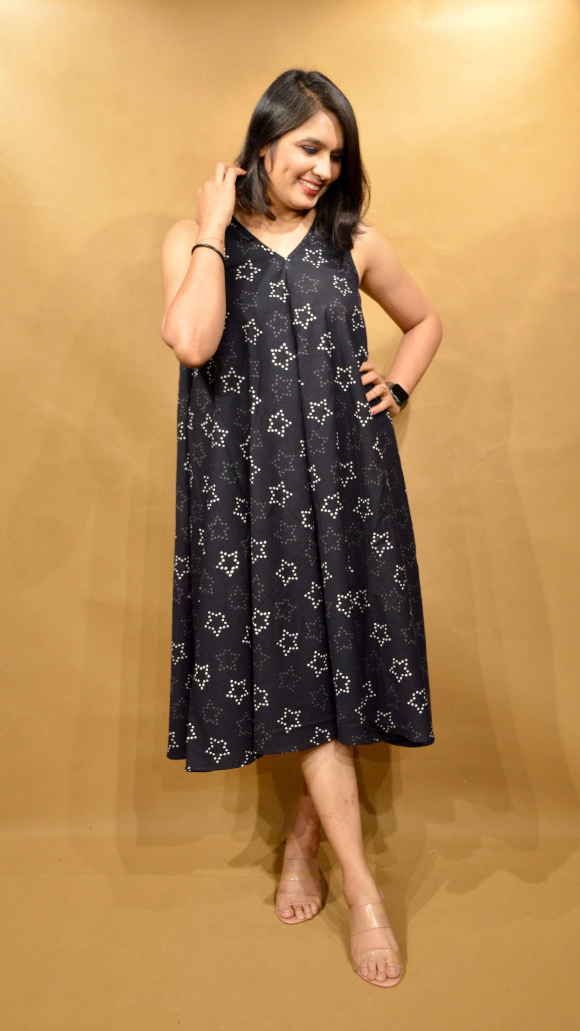 The Sitara circular dress in black, crafted from handblock printed cotton fabric, is the epitome of summer chic. Its lightweight material ensures breathability, keeping you cool on warm days. The intricate handblock print adds a touch of elegance and uniqueness to the garment, while the circular cut offers a flattering silhouette. And with the added convenience of pockets, it's both stylish and practical, perfect for any summer occasion.