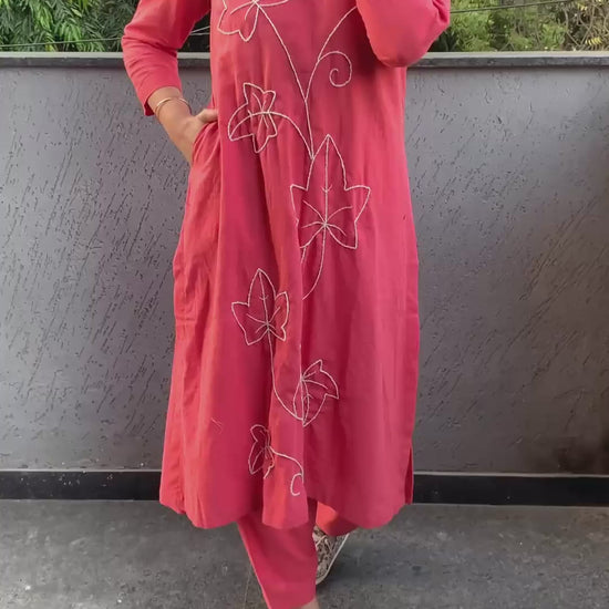 Bring effortless elegance into your everyday style with this beautifully crafted 2-piece co-ord set. Made from soft, breathable cotton slub, the outfit features delicate hand embroidery that adds a touch of charm to your look. The kurta comes with a functional side pocket, while the salwar is designed with a comfortable elasticated waistband for day-long ease.