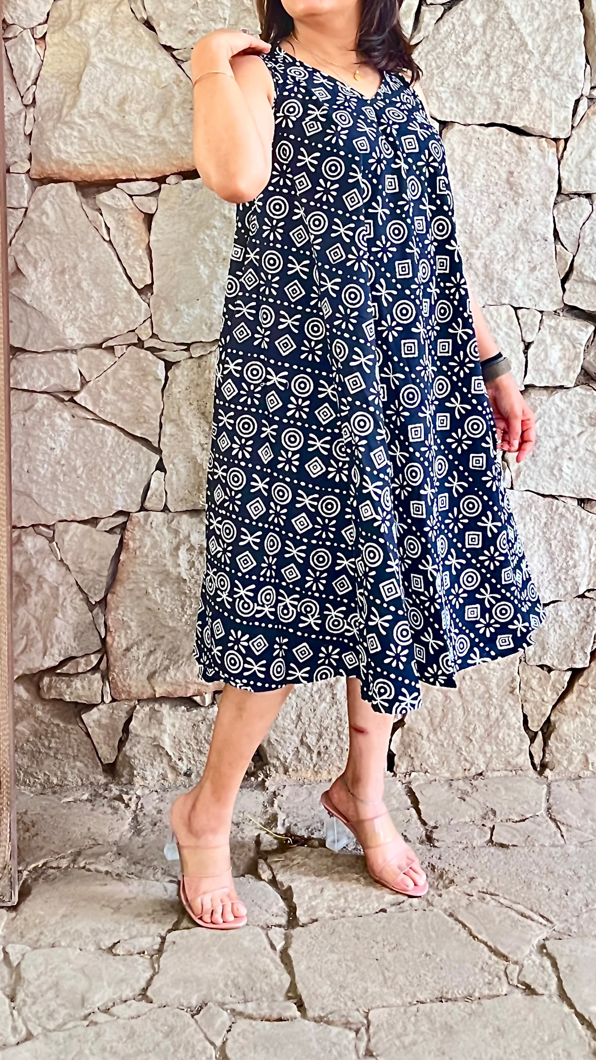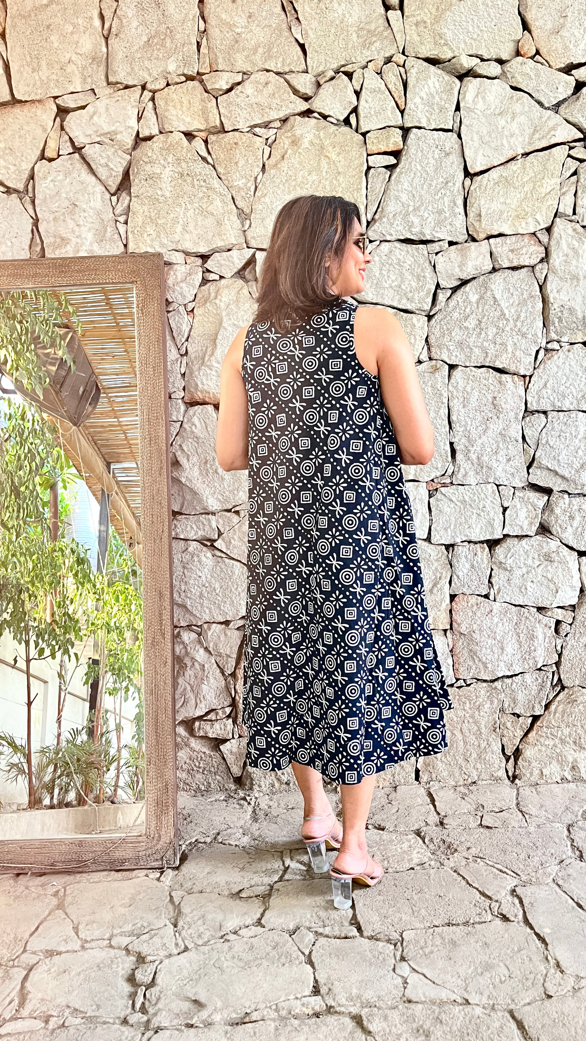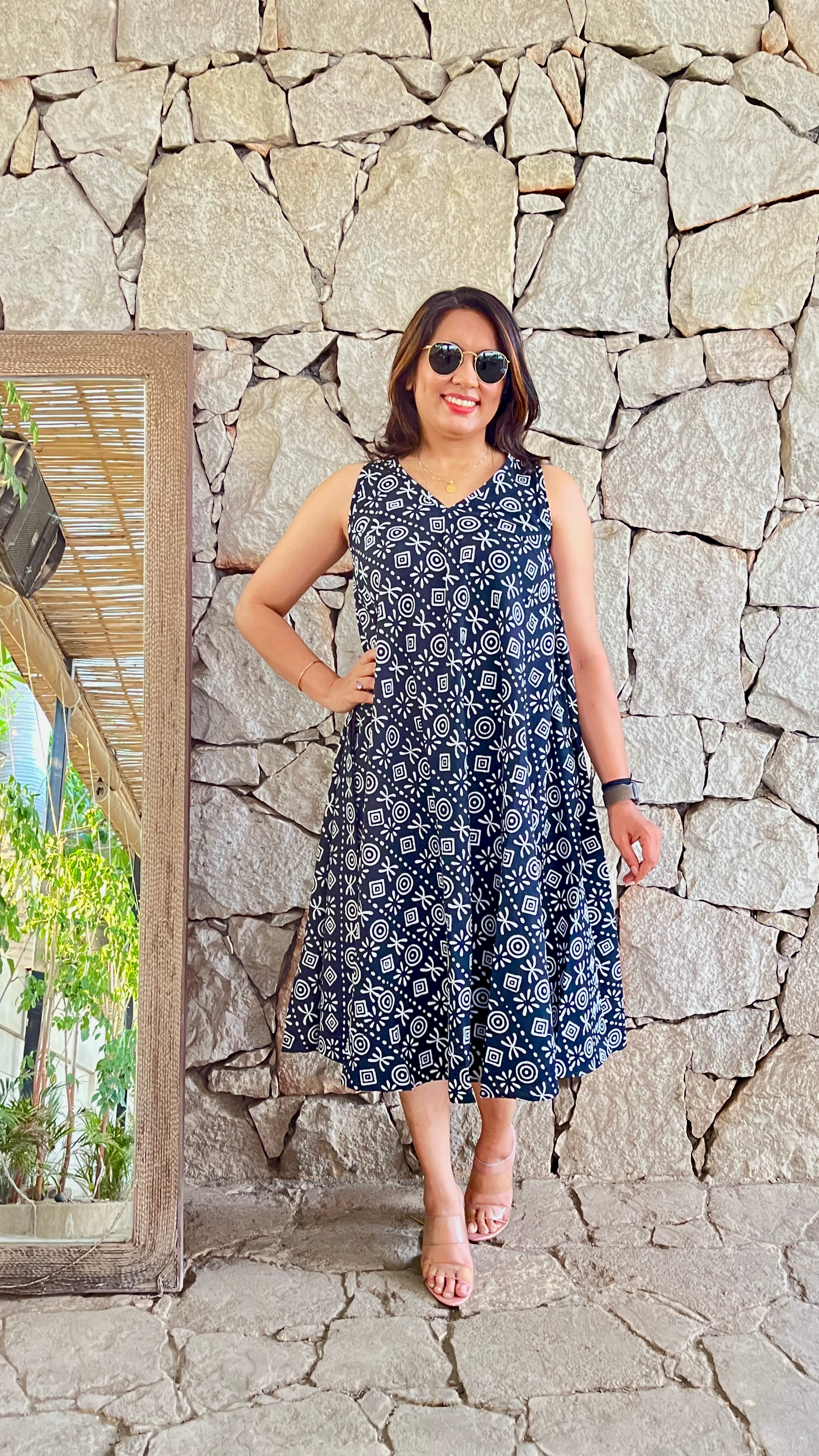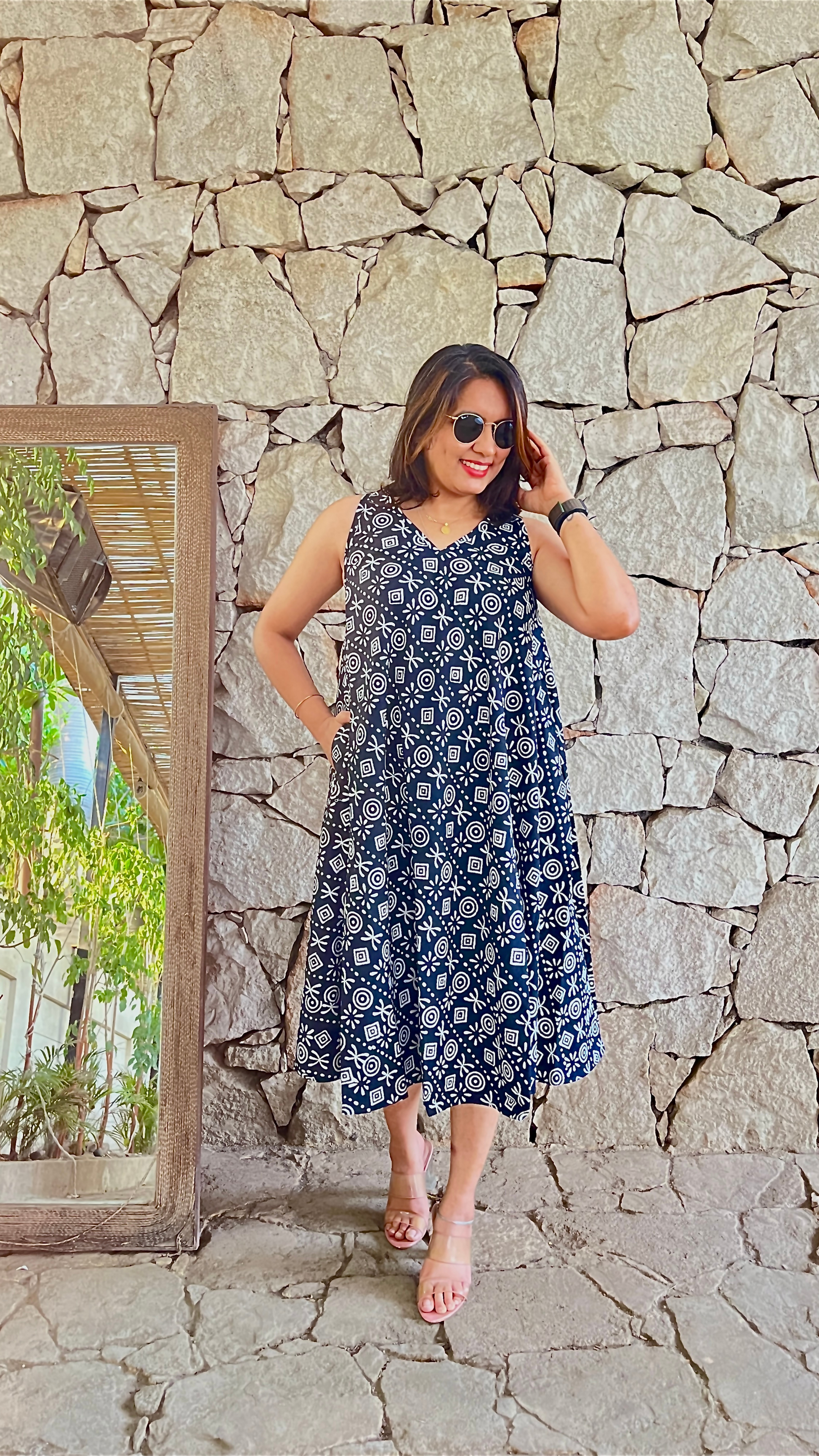 Turn heads with our Printsy Circular Dress – where heritage meets hype. Crafted in soft, breathable 100% cotton fabric , this sleeveless stunner features a hand block-printed indigo-and-white pattern that channels effortless cool with an artsy twist. The flared silhouette flatters every body type, making it your go-to for brunches, beach strolls, or weekend escapes.