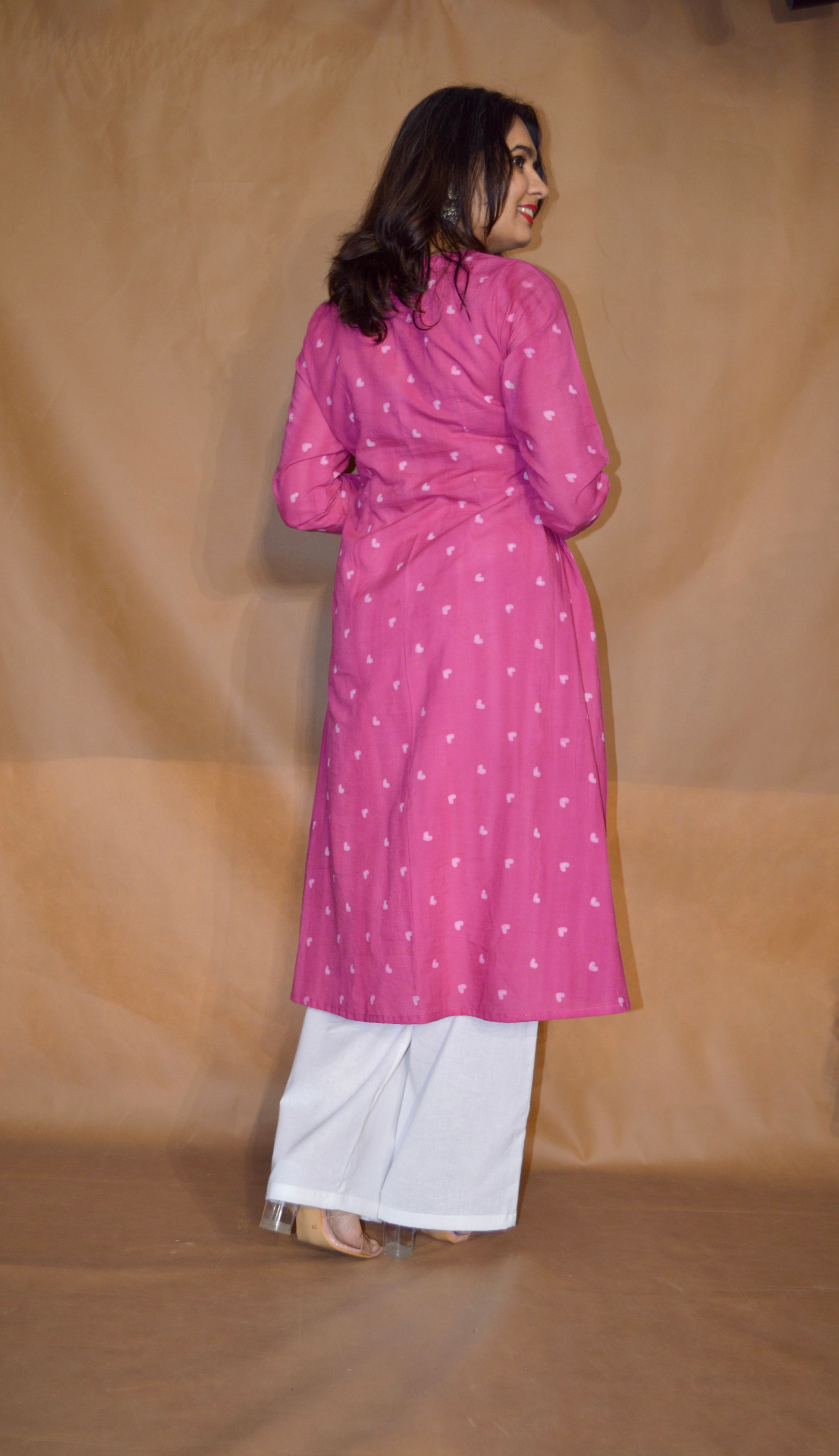 The Fuchsia Love Dabu mul cotton A-Line Kurta brings vibrant pink energy with delicate heart motifs that add charm without overpowering.