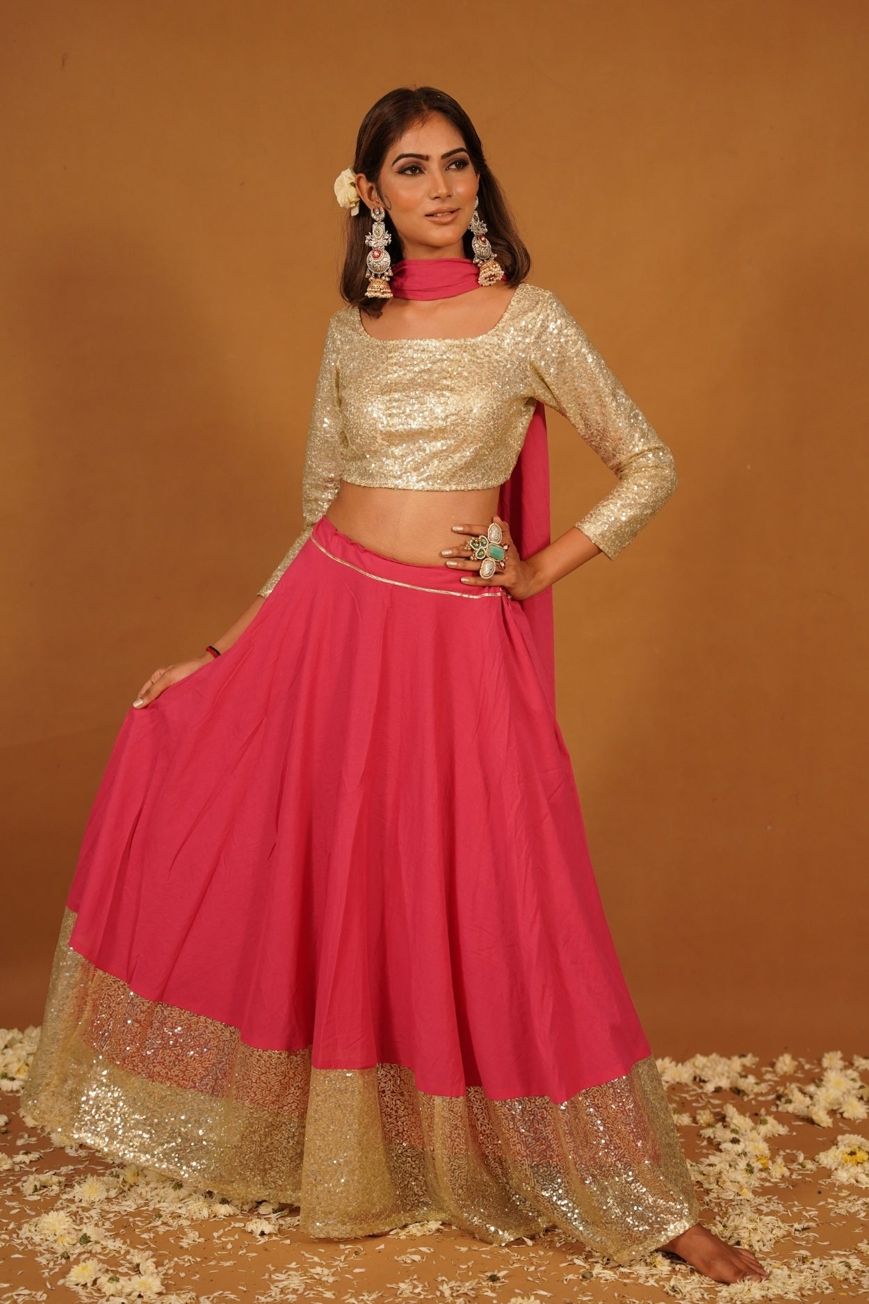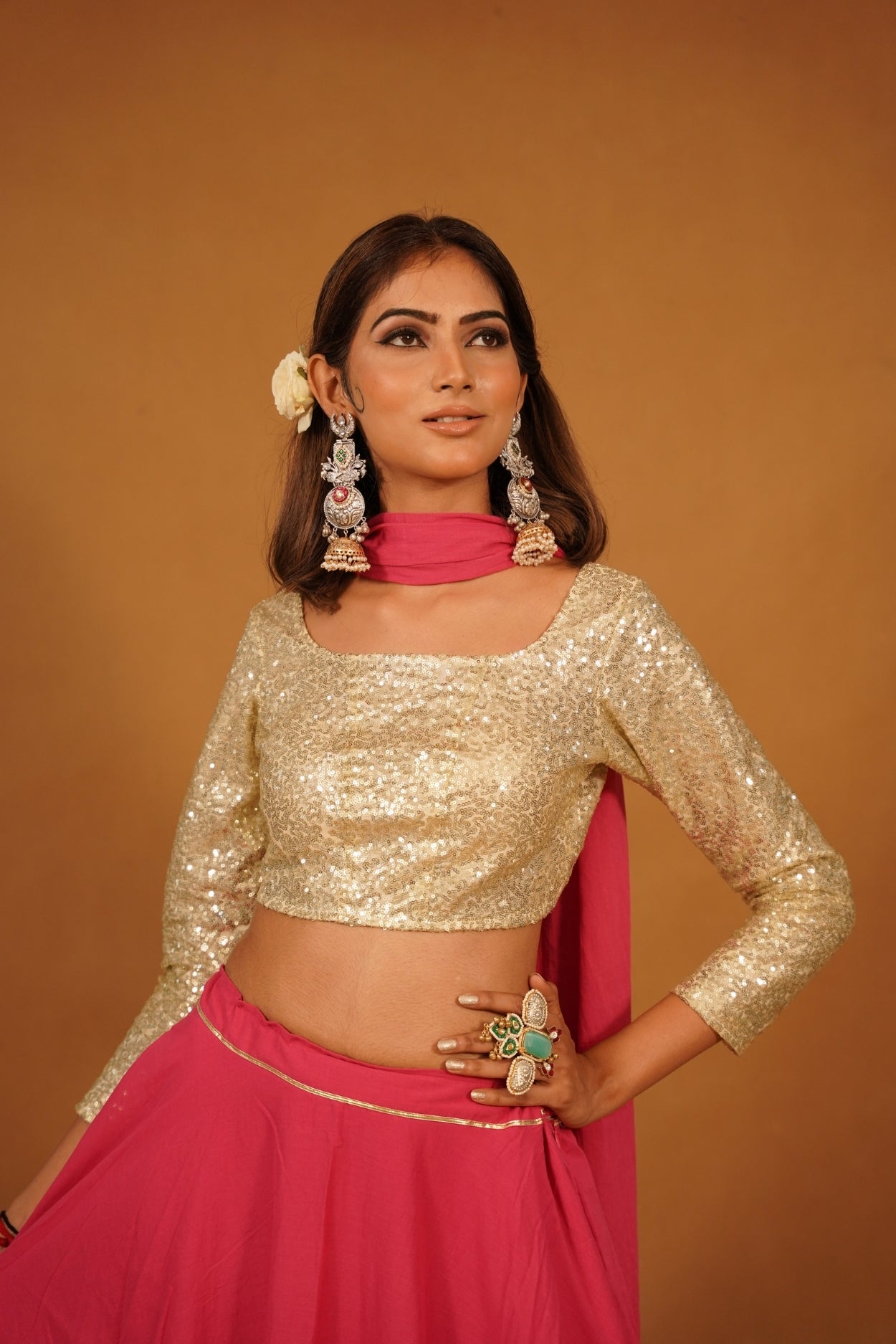 The highlight of this blouse is the intricate sequence detailing that envelops the fabric, catching the light beautifully and creating a radiant effect with every movement. The shimmering golden hues add an opulent touch, ensuring you stand out at weddings, parties, or celebrations. This blouse perfectly complements sarees, lehengas, or even high-waisted skirts, offering versatile styling options that cater to various fashion preferences.