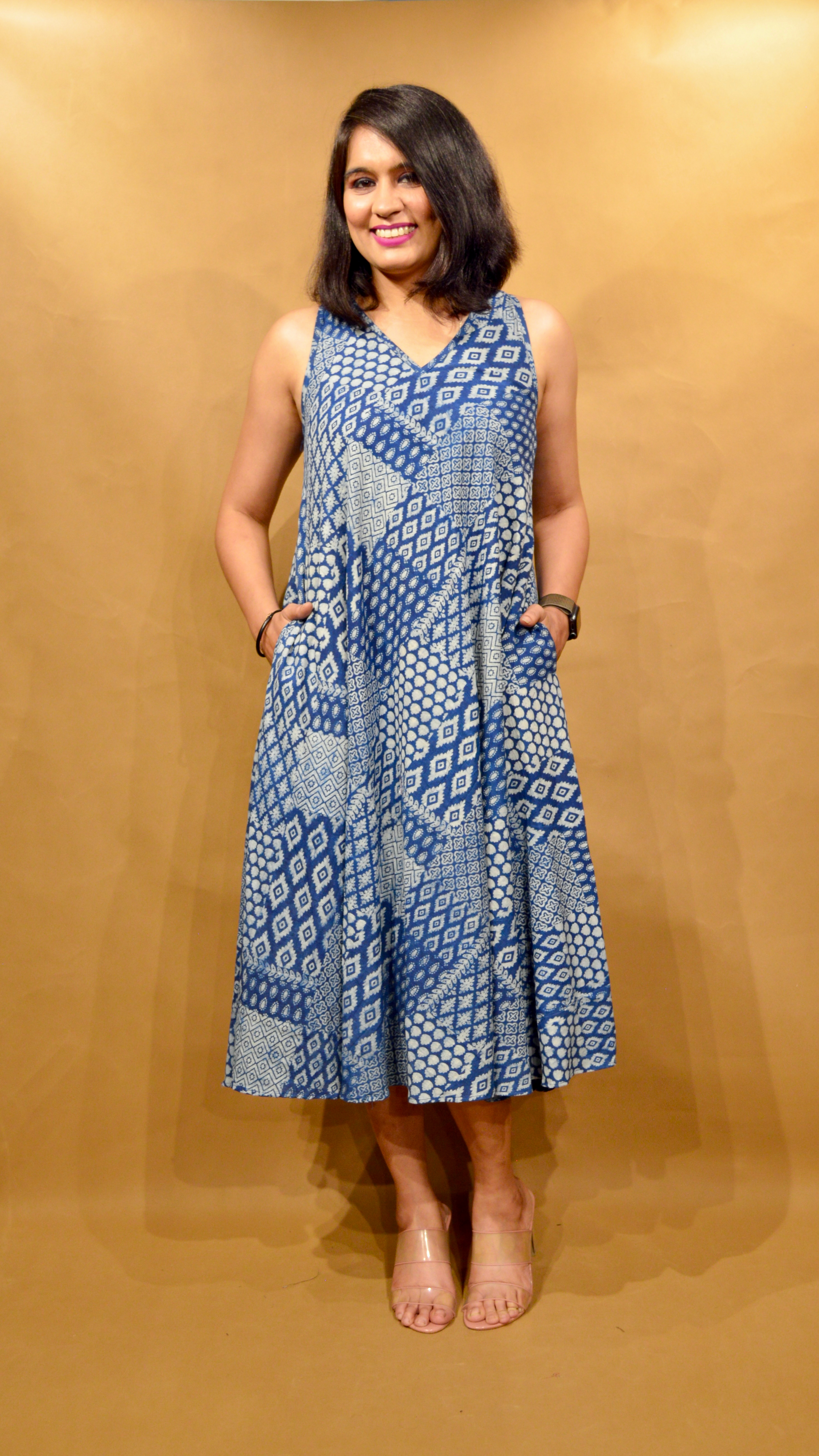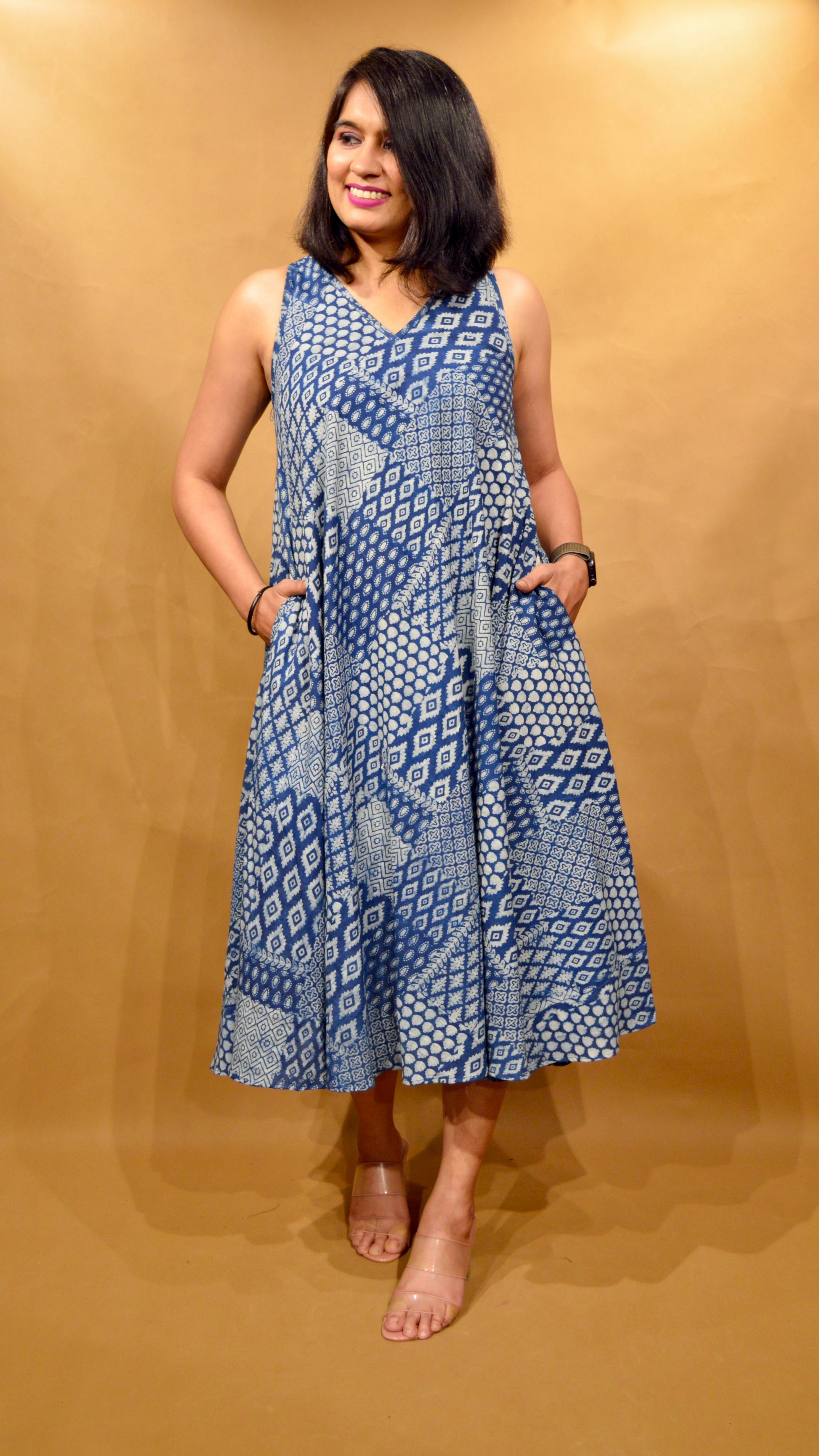 Embrace the charm of artisanal craftsmanship with this indigo multi-print dress, crafted from luxurious cotton and adorned with intricate handblock designs. Each print tells a story of traditional artistry, blending patterns that evoke a sense of cultural heritage and contemporary style.