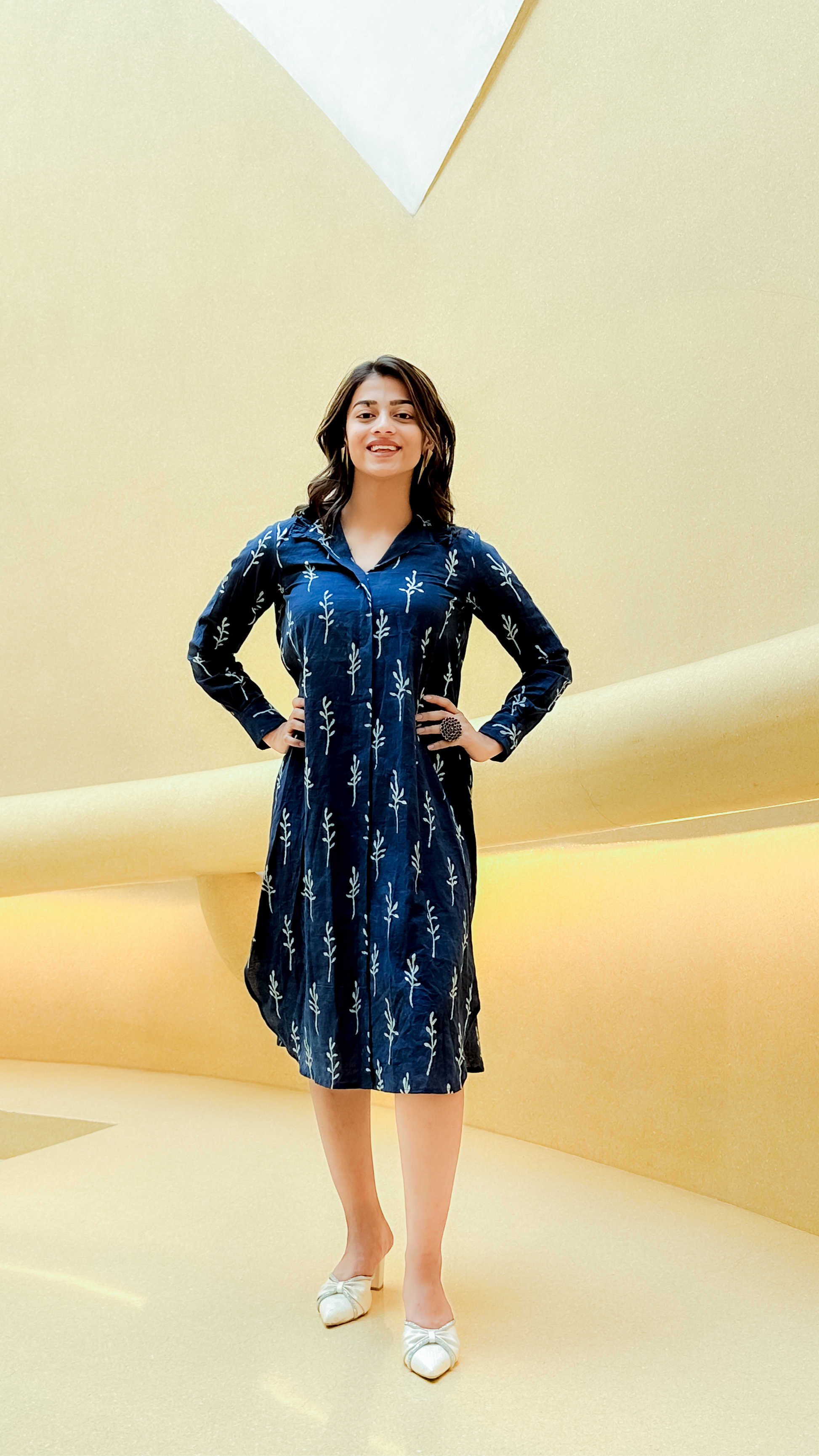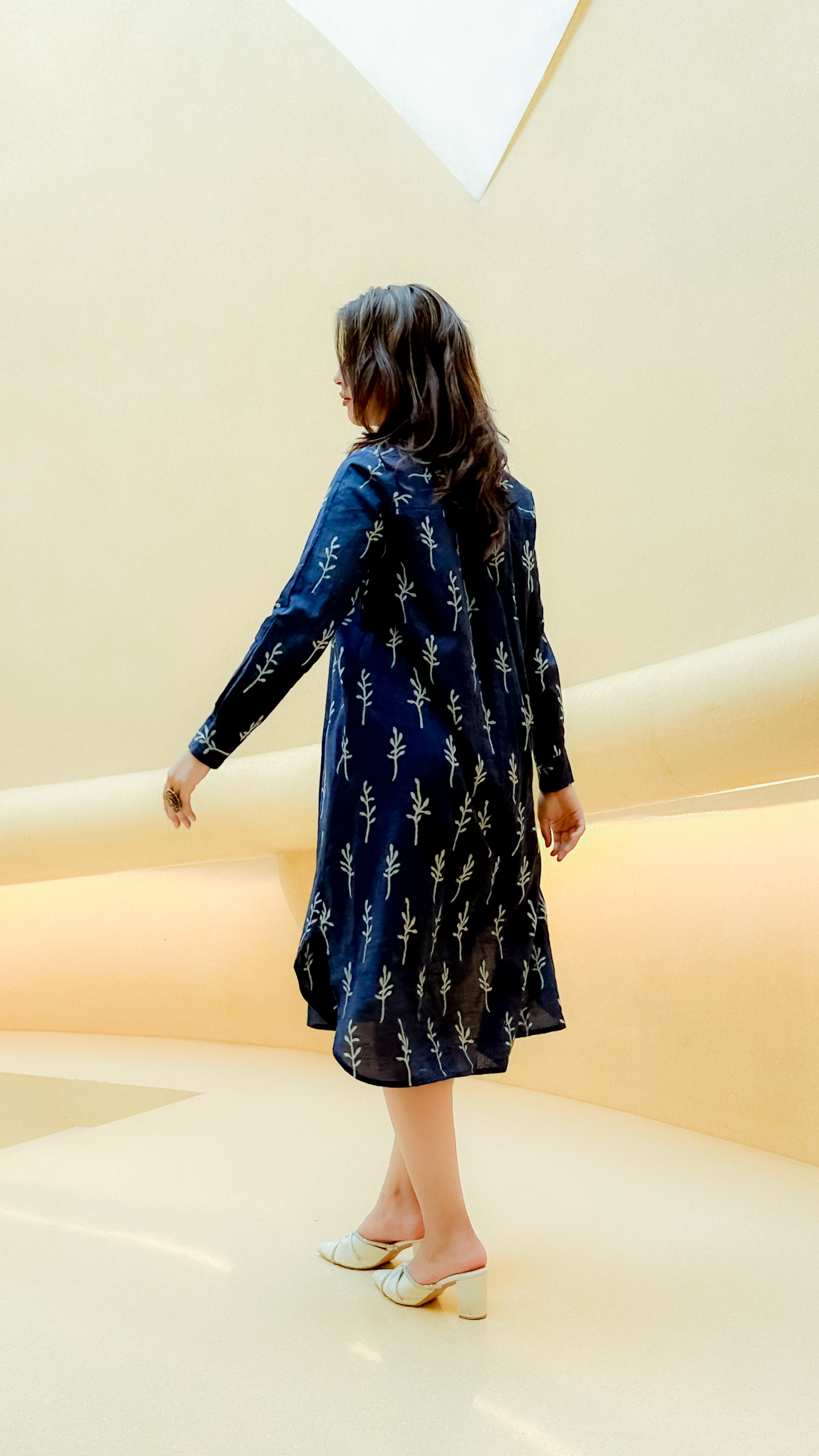 "Elevate your summer style with our enchanting long shirt dress, adorned with delightful frilled collar details. Meticulously crafted from handblock printed pure cotton fabric, this dress exudes charm and sophistication. Embrace the warm weather in effortless elegance with its flowing silhouette and breezy feel, making it a perfect choice for both casual outings and special occasions."