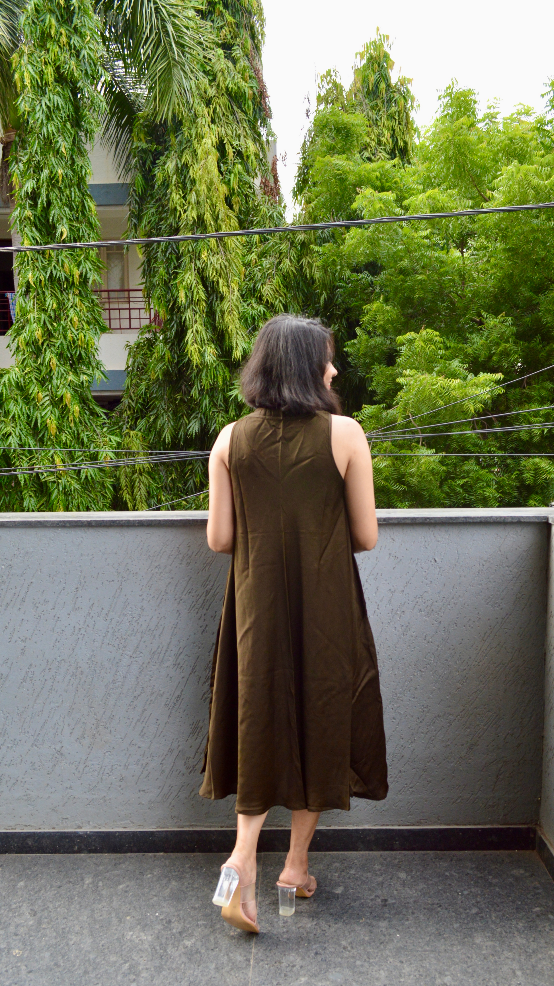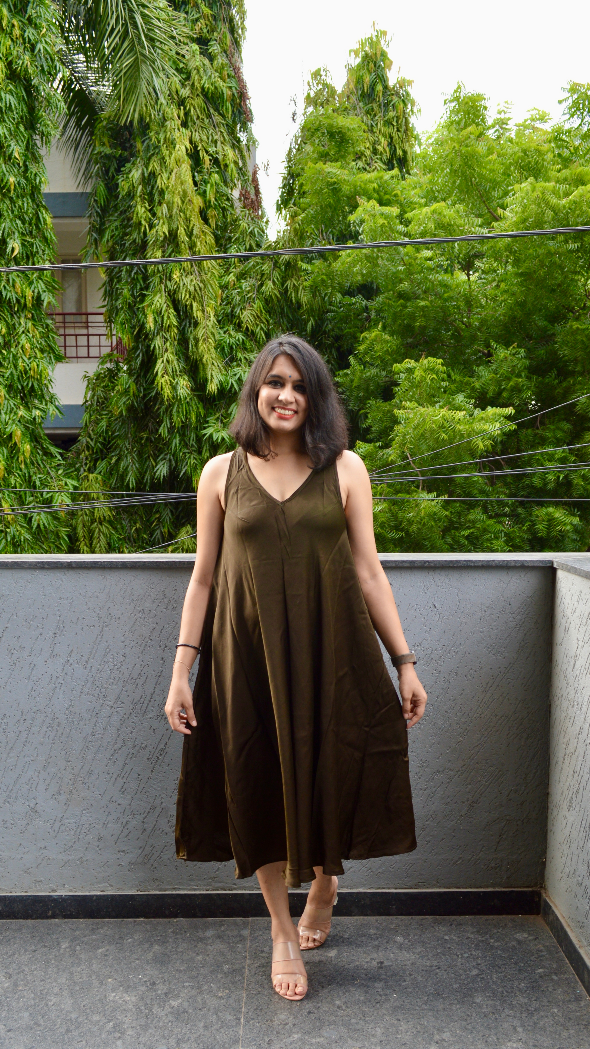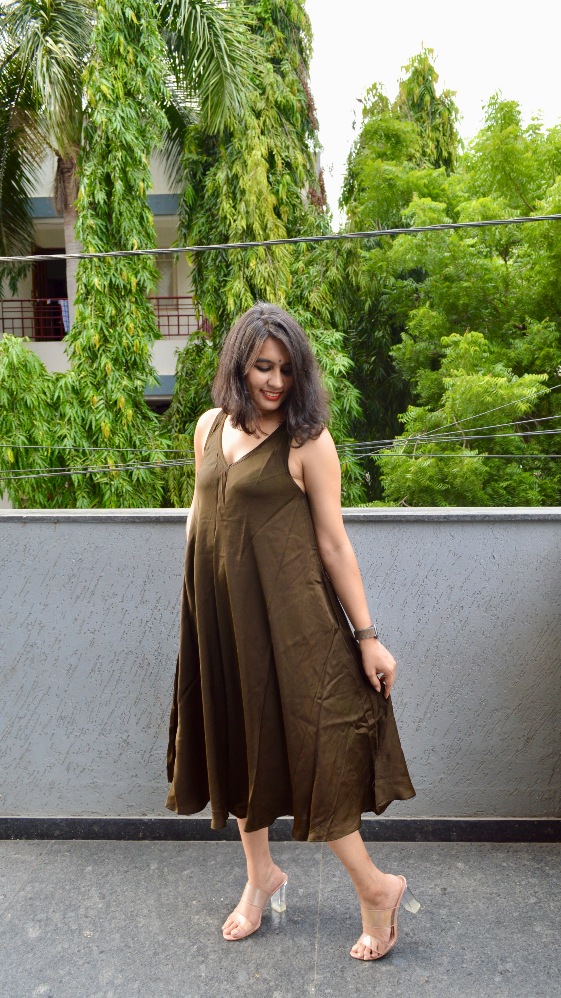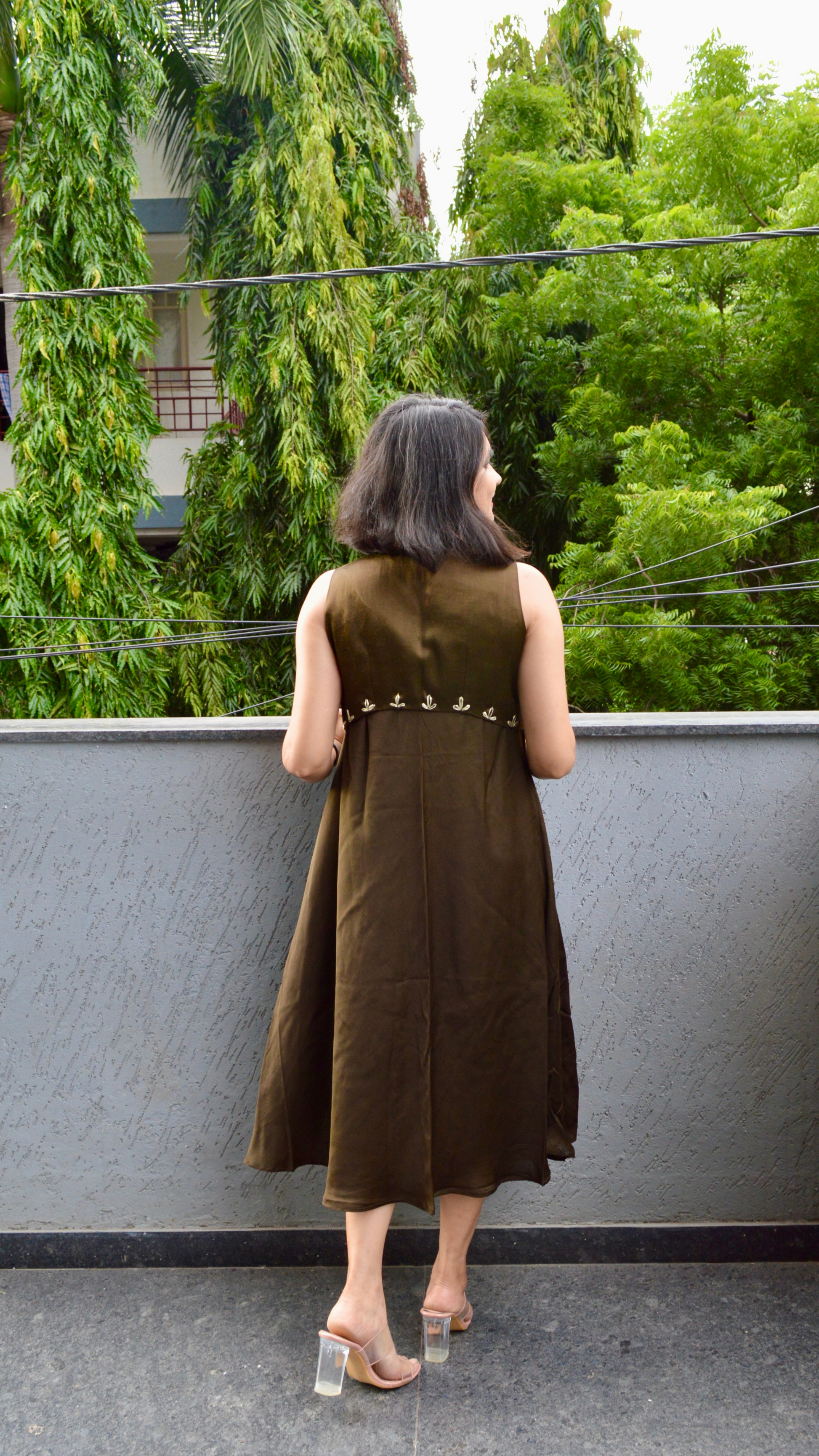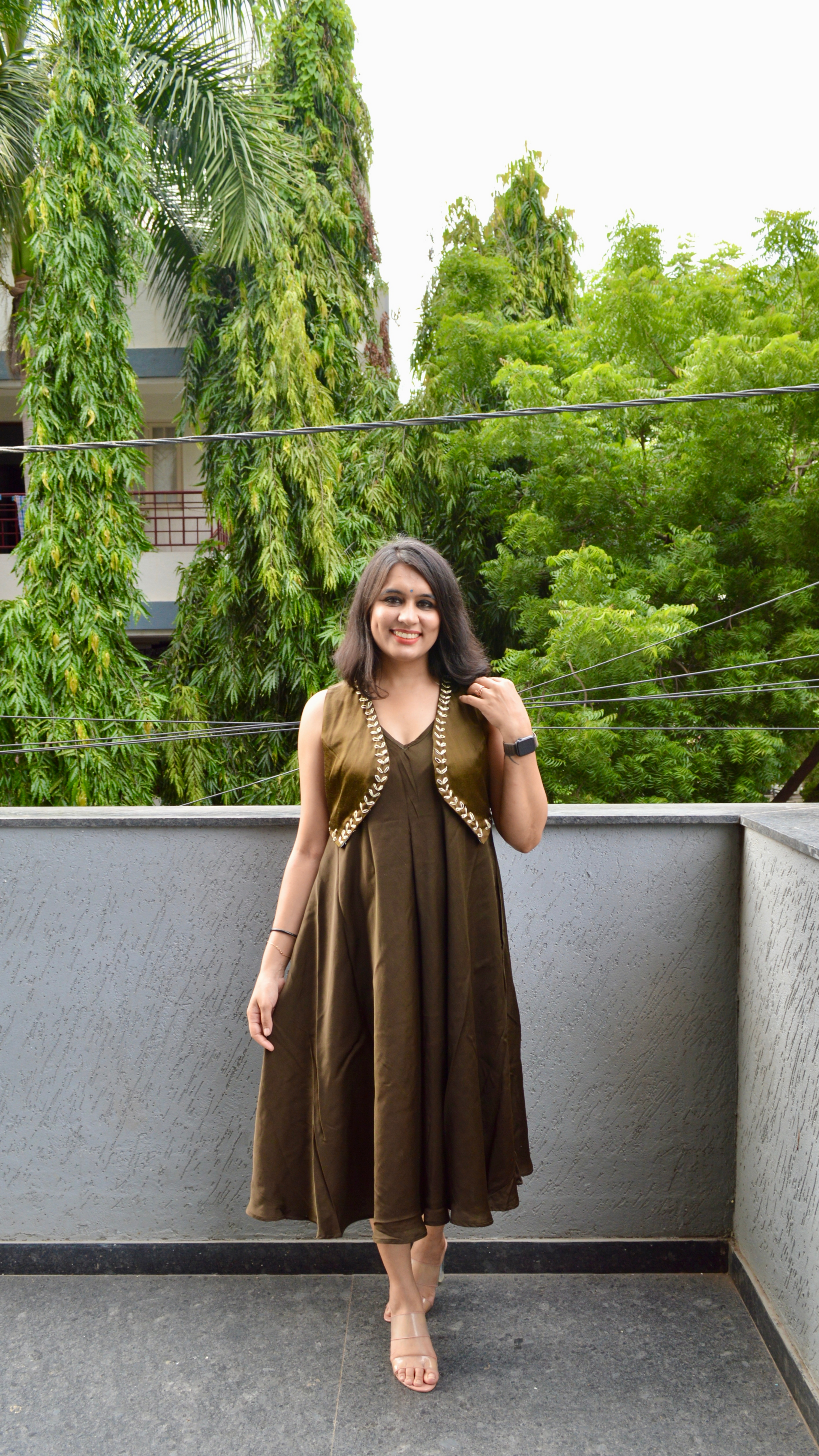 Olive Green Silk Circular Dress with Hand Embroidered Jacket