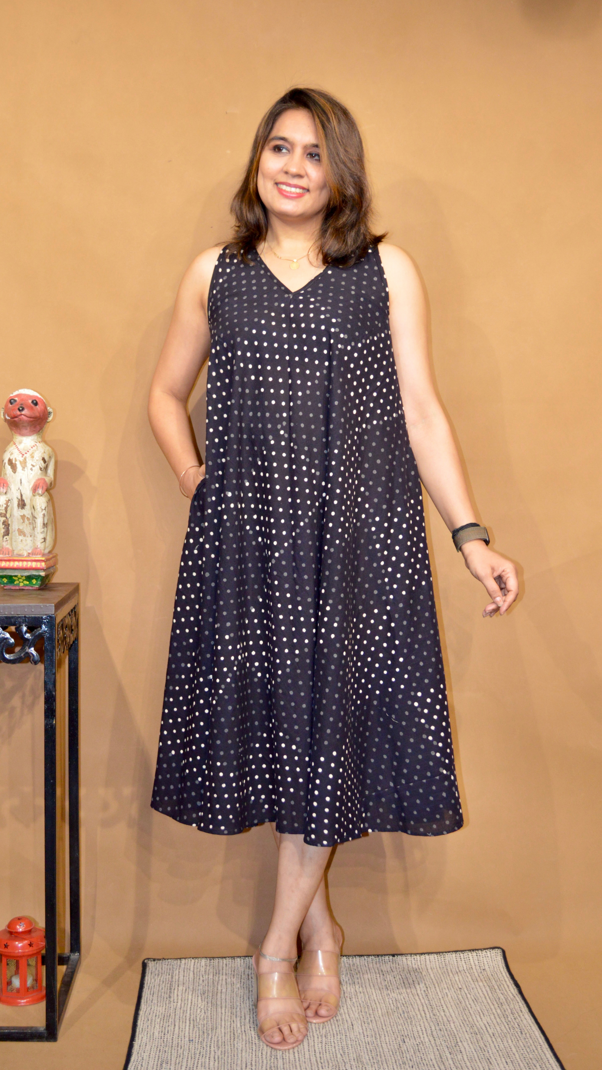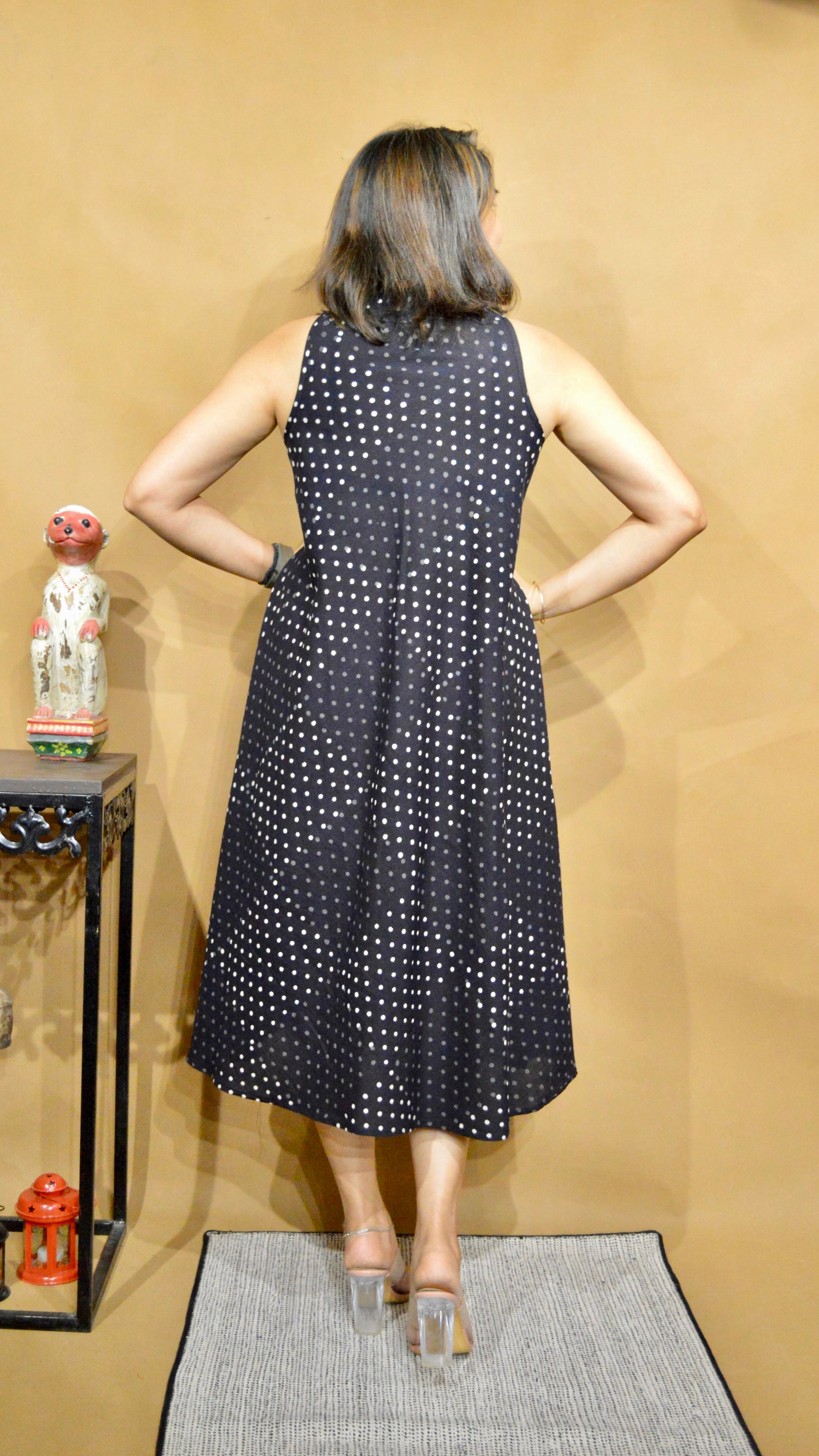 Add a playful twist to your wardrobe with this charming polka dot sleeveless midi dress. Designed with a flattering A-line silhouette and a soft V-neckline, The Midnight Monochrome Circular Dress exudes effortless style and comfort. The classic black base with all-over white polka dots gives it a timeless appeal, perfect for brunches, casual outings, or even a relaxed evening look.
