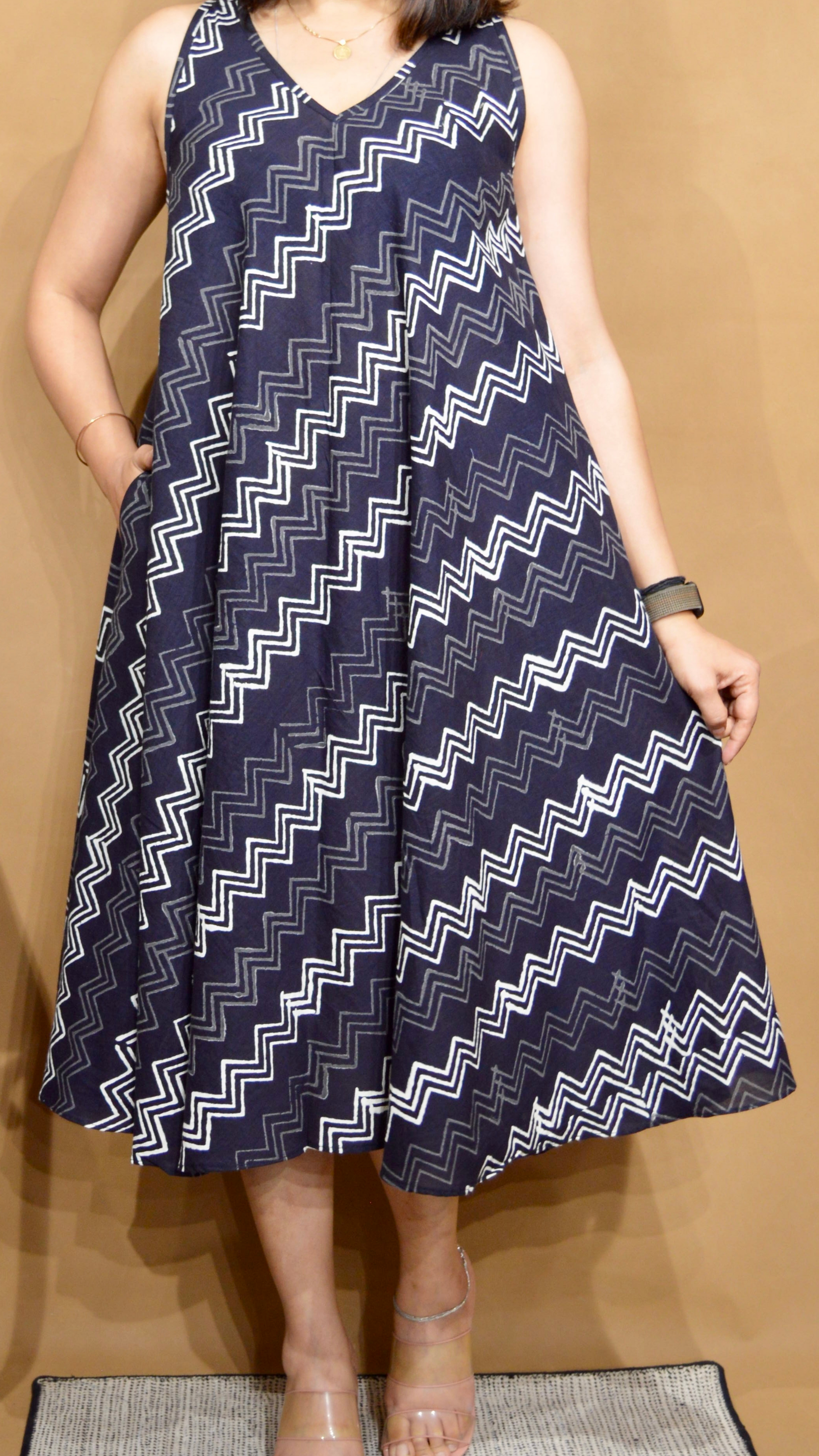 Make a statement with this elegant Midnight Black sleeveless midi dress featuring a striking white zigzag pattern. Crafted from soft, breathable 100% cotton fabric, The Monochrome Motion Circular dress is perfect for casual outings, summer gatherings, or relaxed evenings. The flattering A-line silhouette and V-neck design complement all body types, offering both comfort and style. Pair it with flats or heels to complete the look.