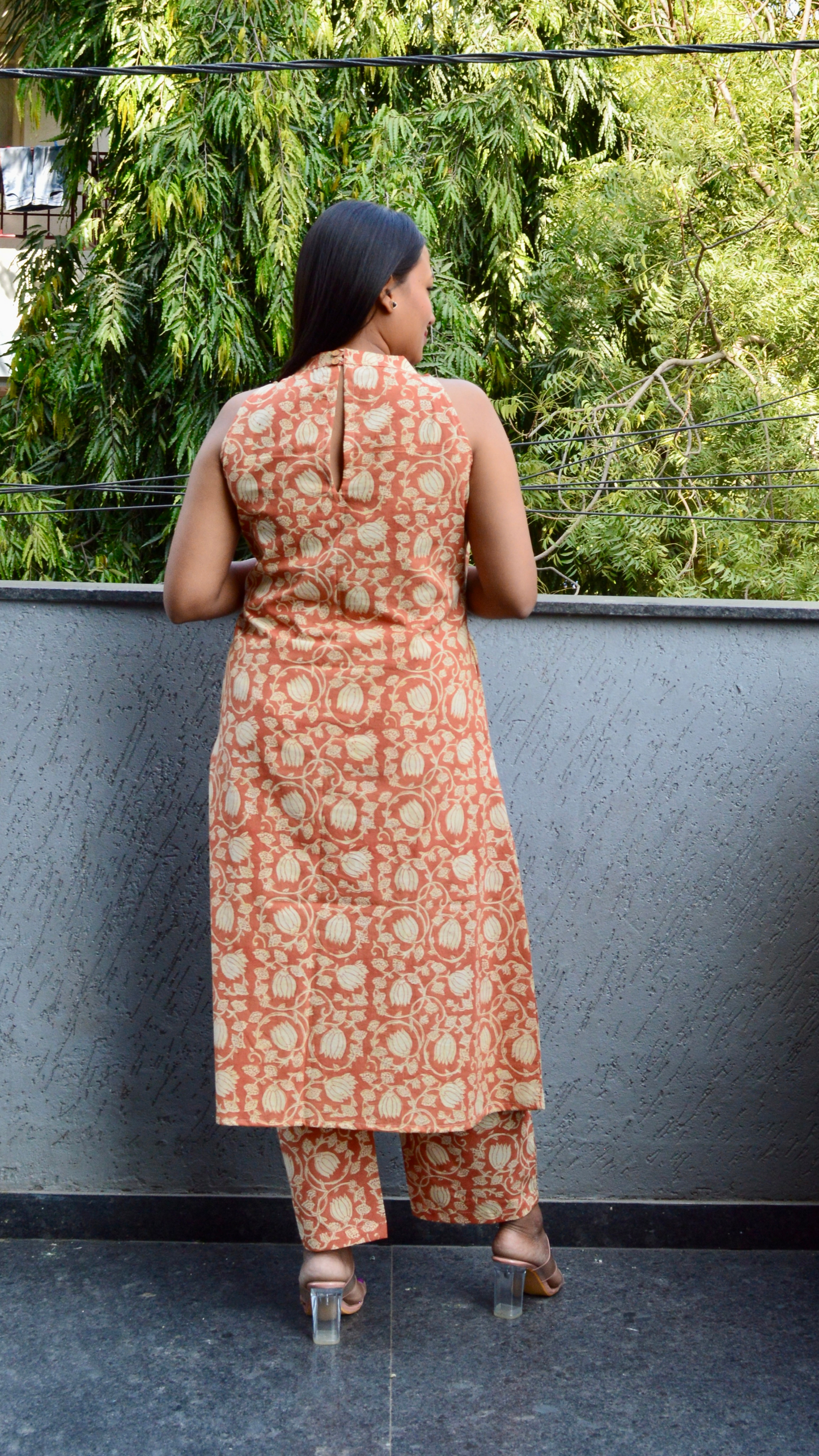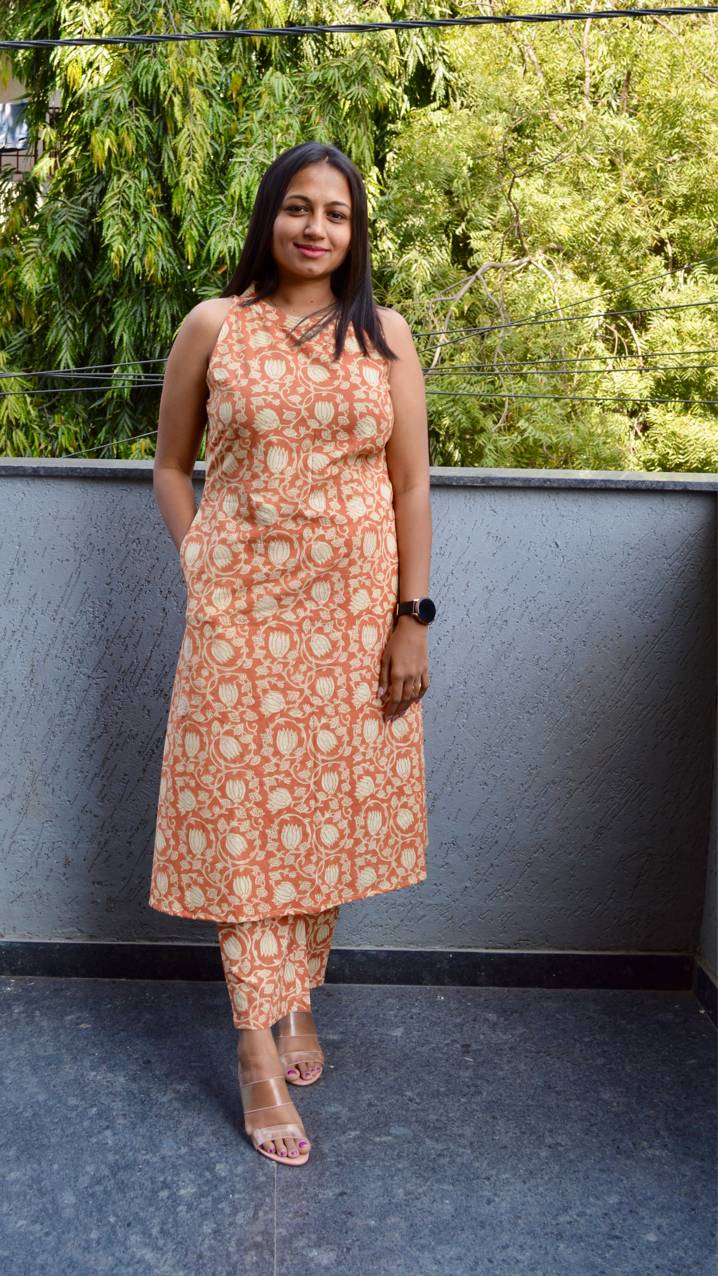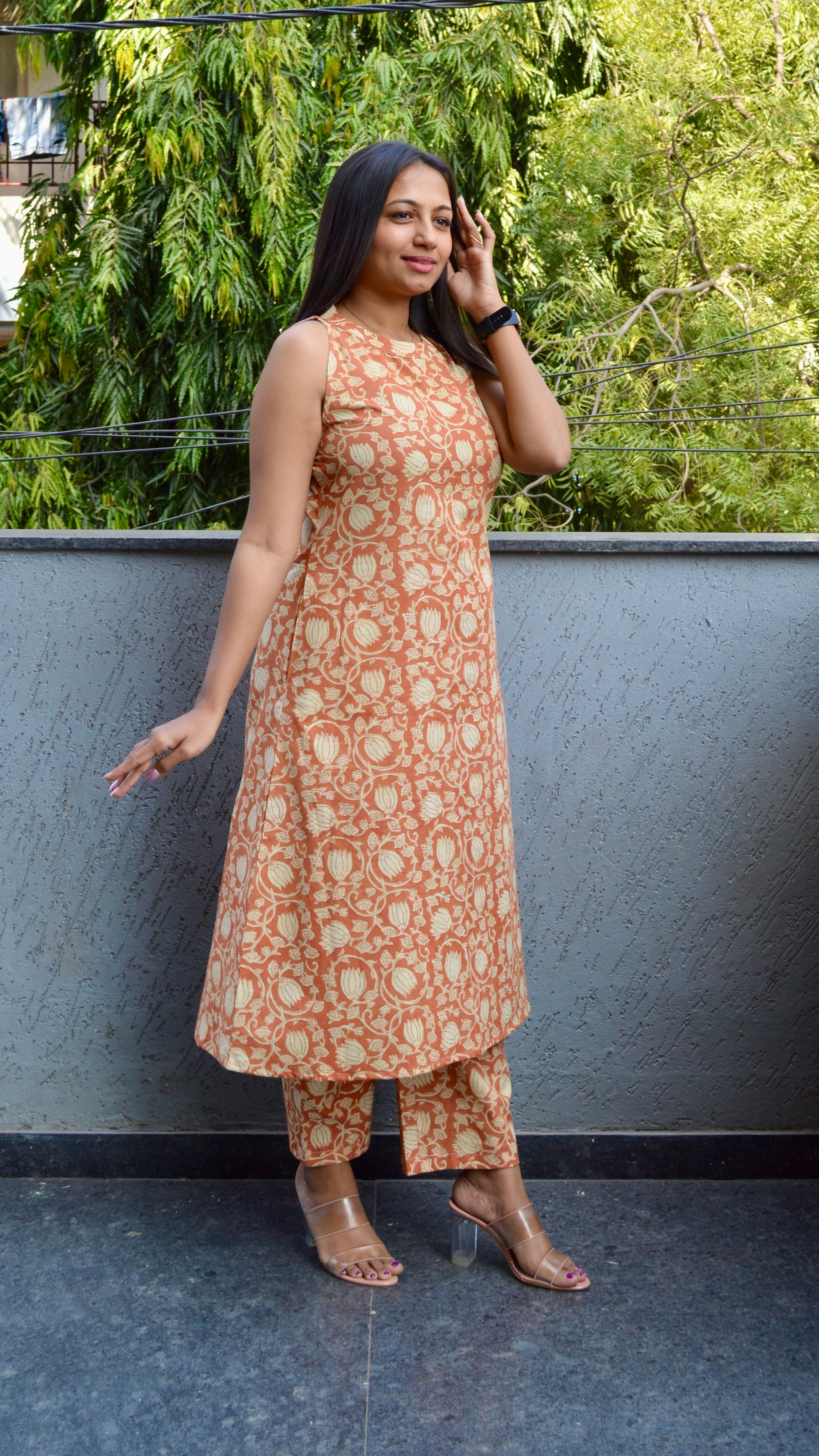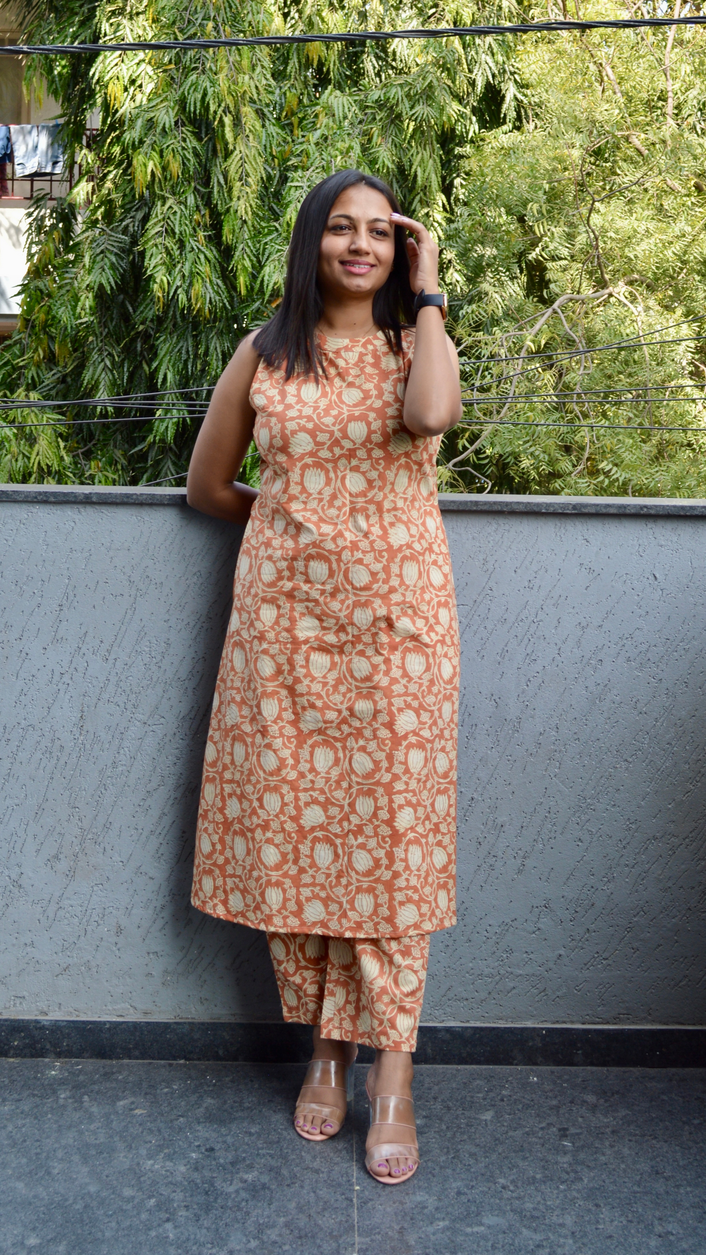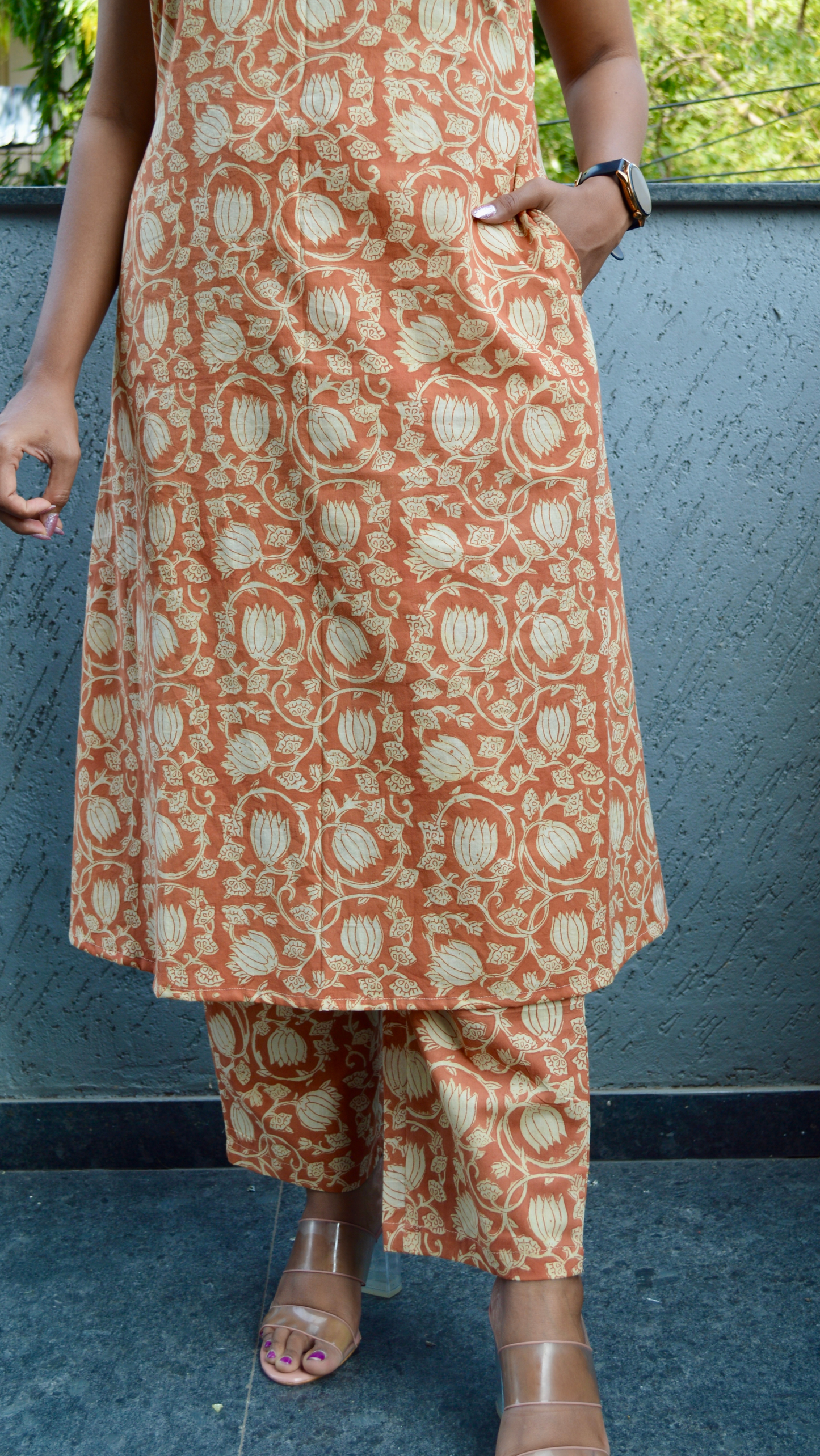 The pants, tailored to perfection, complement the kurta beautifully, creating a balanced and cohesive ensemble that works for a variety of occasions. Whether you're attending a business meeting, meeting friends for a casual lunch, or simply enjoying a relaxed day at home, this Kalamkari kurta-pant set offers an effortlessly chic and versatile option. Its blend of cultural richness, modern functionality, and comfort makes it an essential piece for any wardrobe, offering endless styling possibilities from the office to everyday outings.