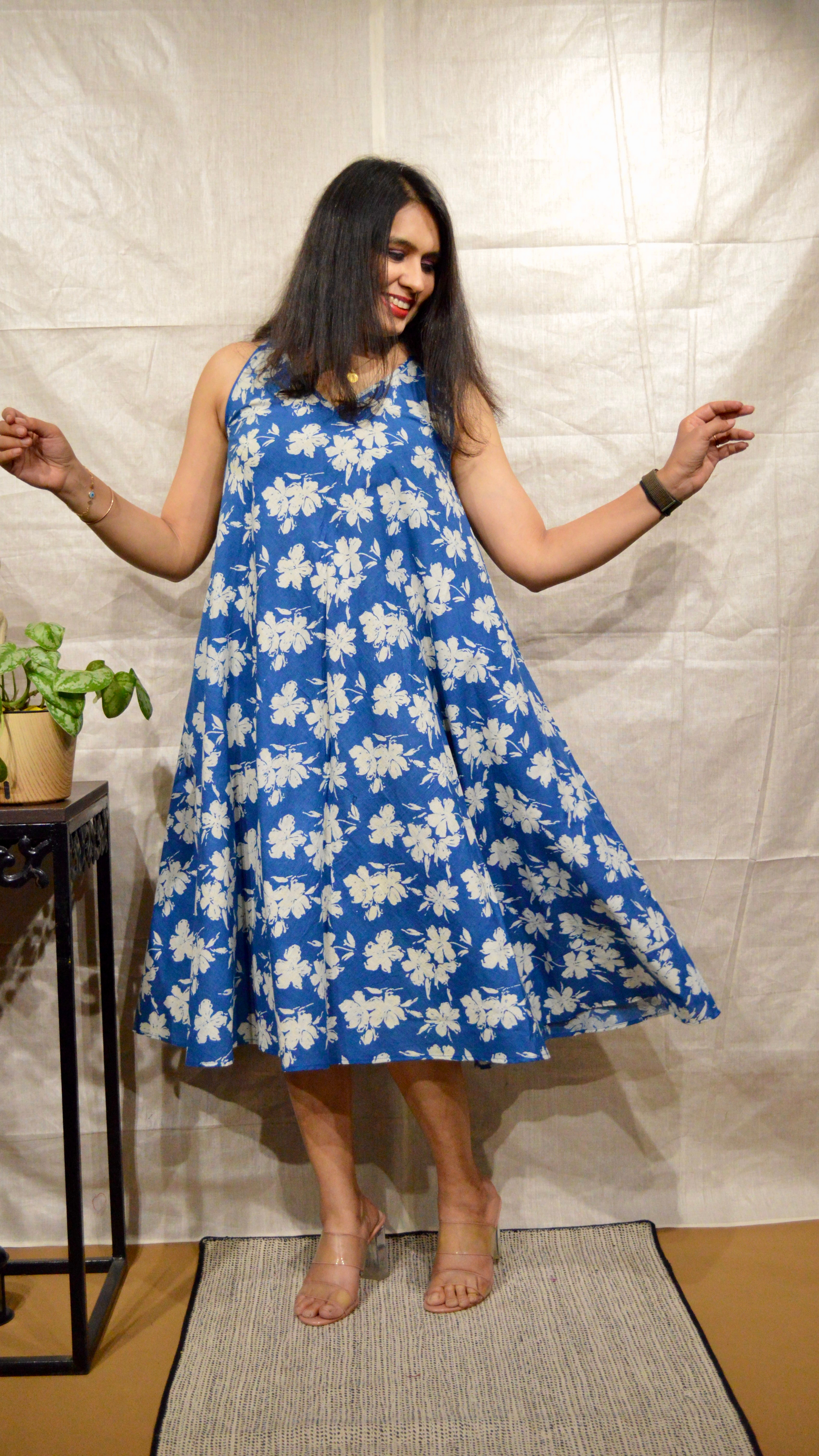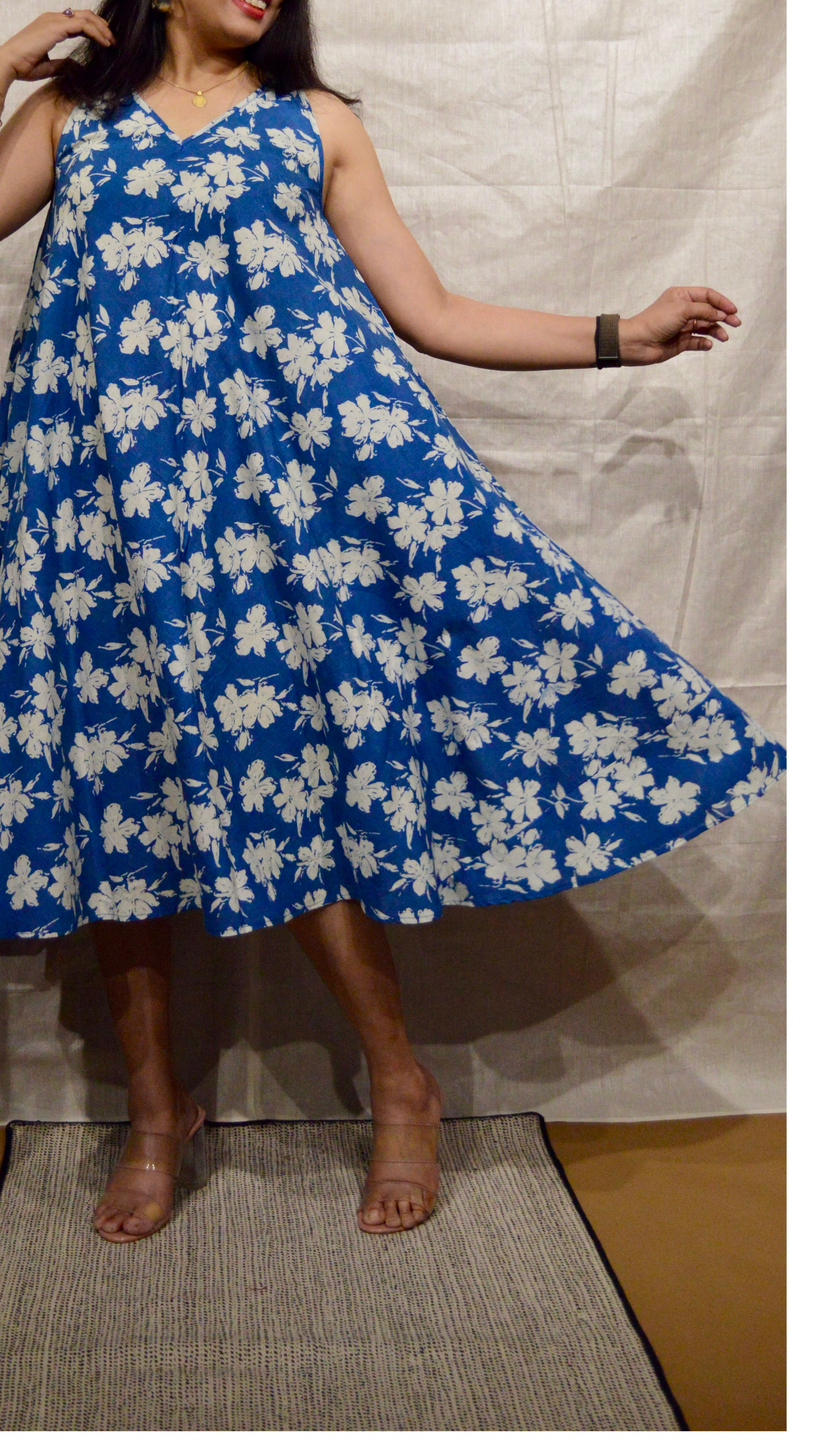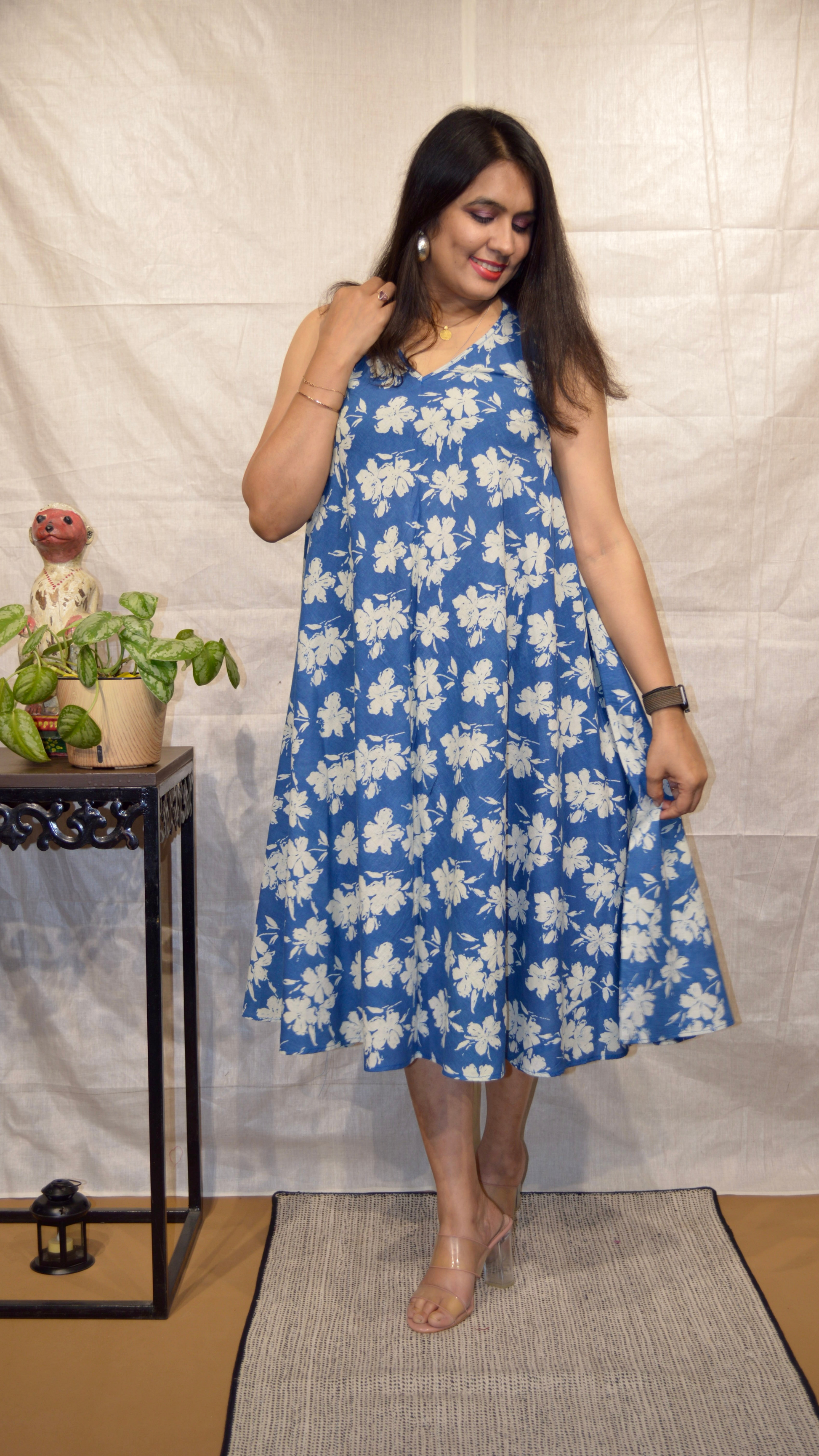 Adorn yourself in the timeless elegance of this powder blue circular dress, meticulously crafted from soft cotton fabric. Each inch of the dress showcases the artistry of handblock printing, where skilled artisans have delicately imprinted intricate patterns in shades of indigo and ivory. The dress flows gently with its flared silhouette, offering both comfort and grace. Its round neckline and short sleeves add a touch of simplicity, while the cinched waist subtly defines your figure. Perfect for a sunny day or a casual evening, this dress effortlessly combines artisanal craftsmanship with everyday sophistication .