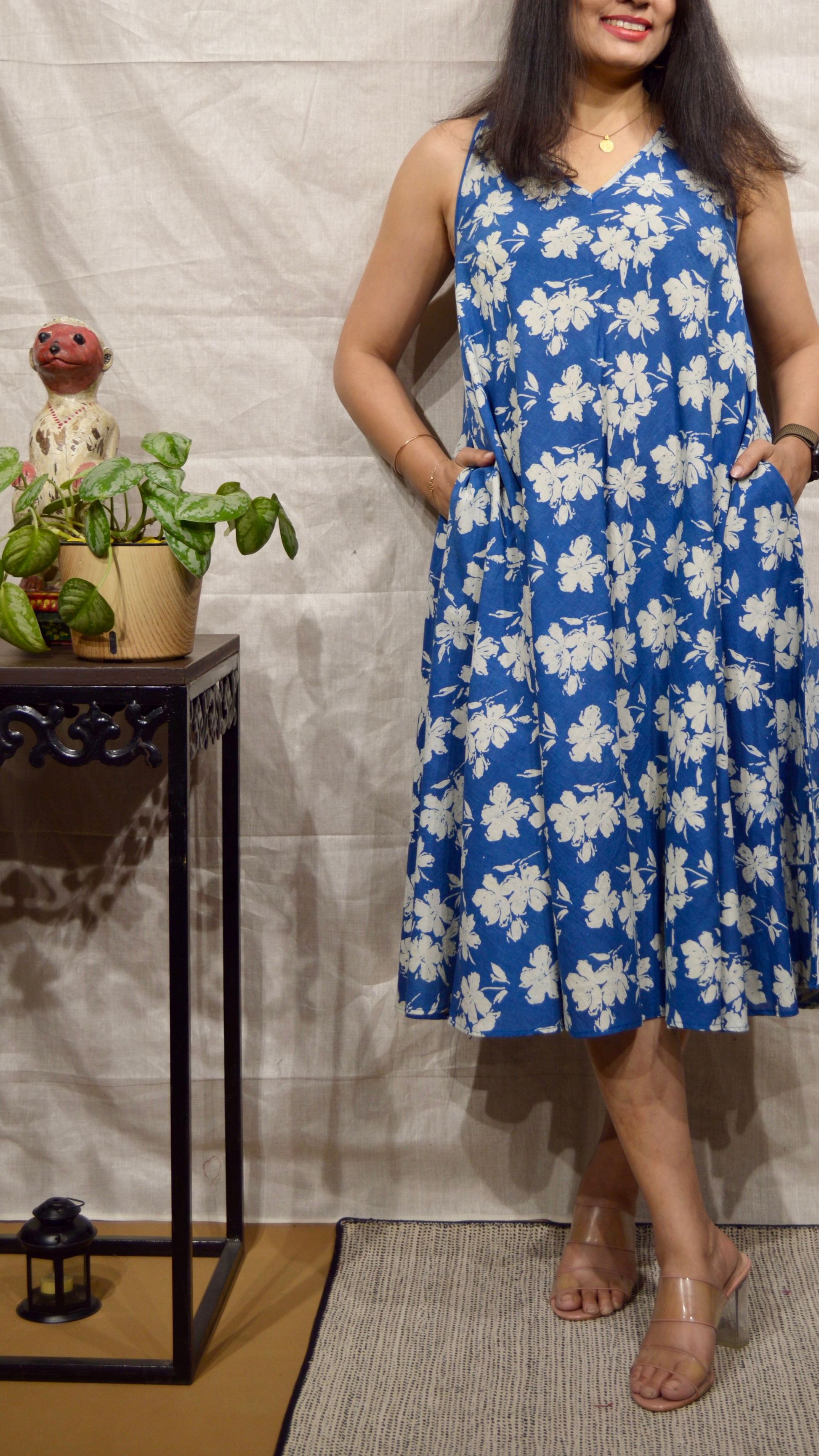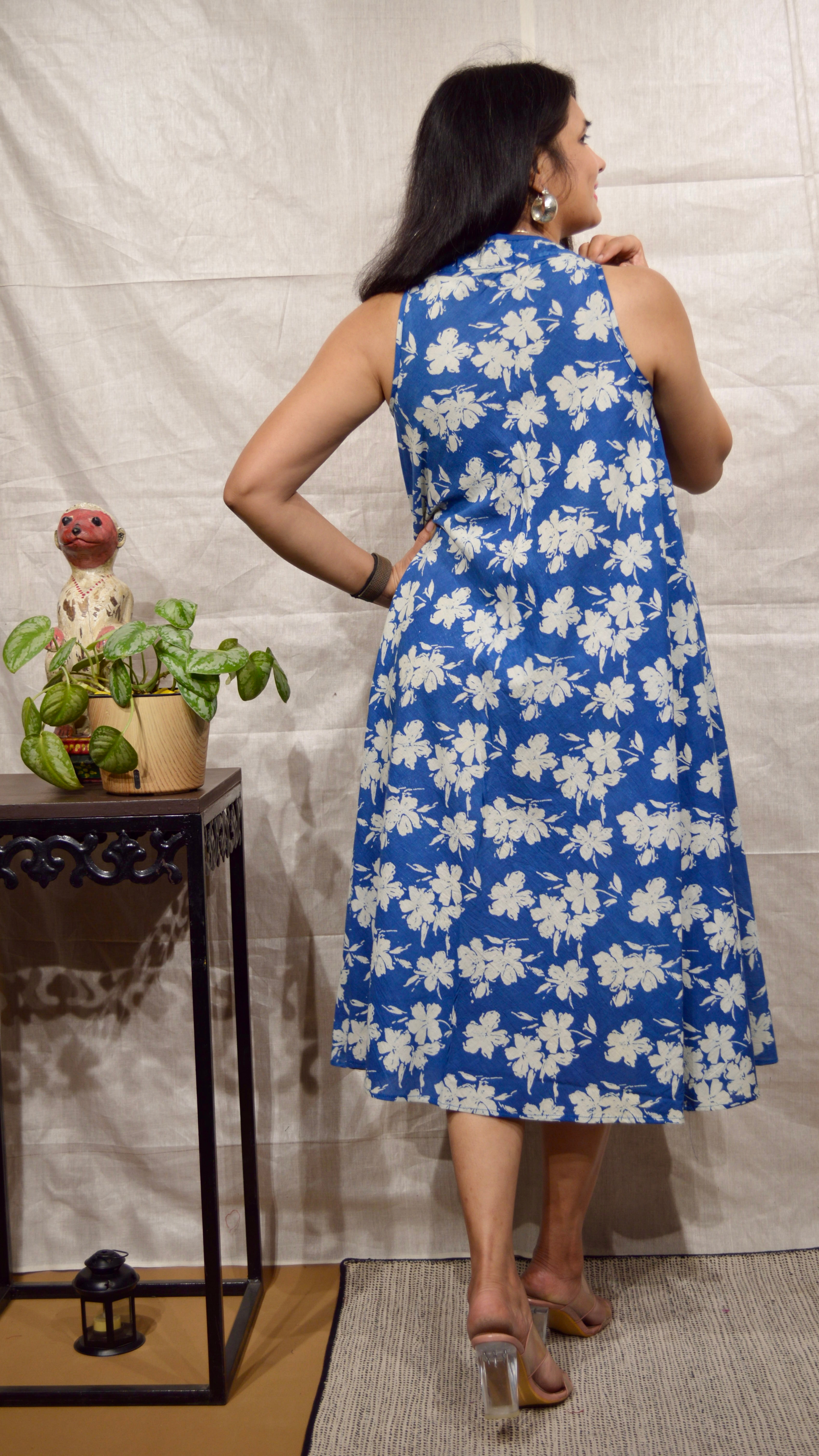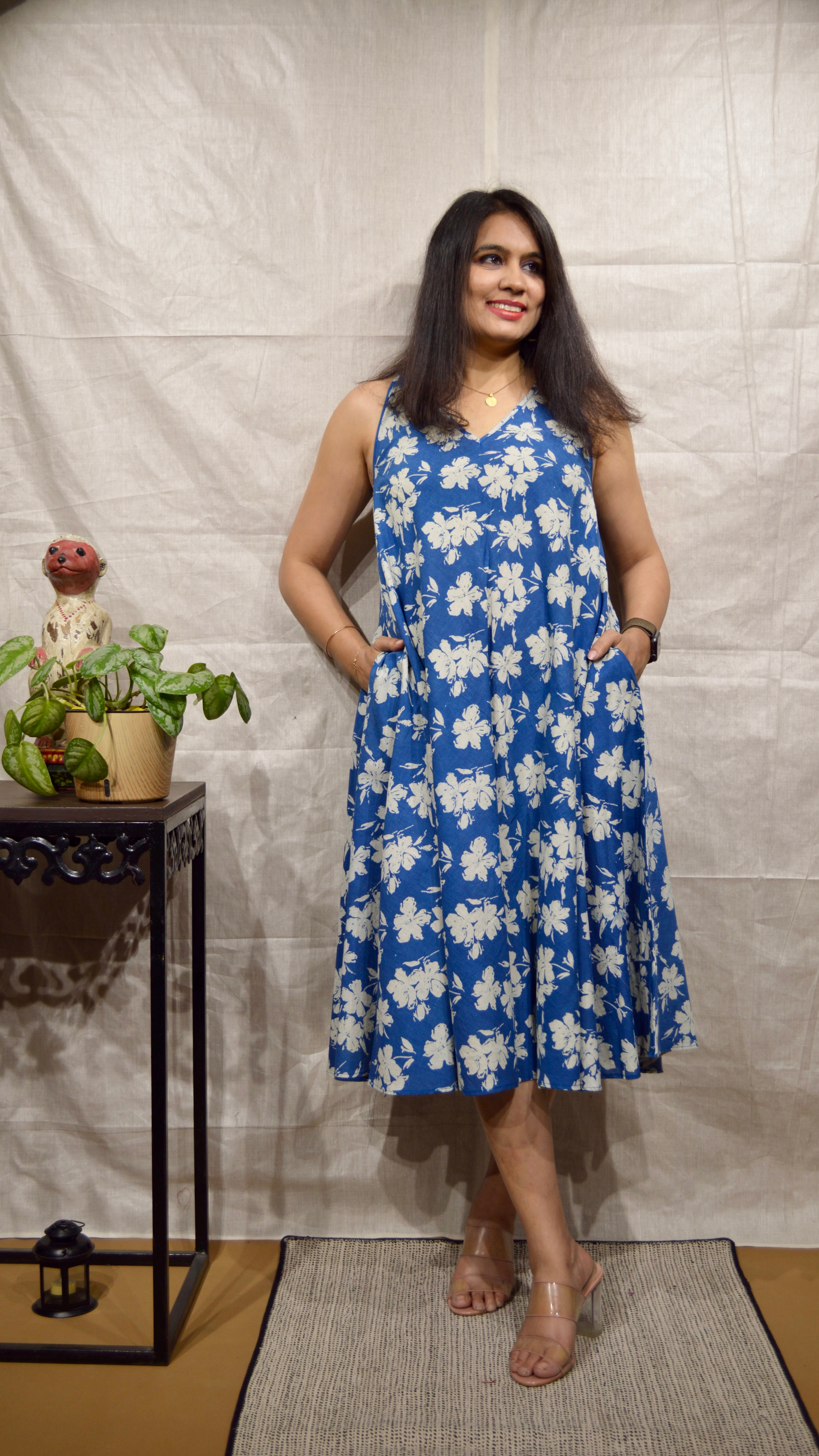 Adorn yourself in the timeless elegance of this powder blue circular dress, meticulously crafted from soft cotton fabric. Each inch of the dress showcases the artistry of handblock printing, where skilled artisans have delicately imprinted intricate patterns in shades of indigo and ivory. The dress flows gently with its flared silhouette, offering both comfort and grace. Its round neckline and short sleeves add a touch of simplicity, while the cinched waist subtly defines your figure. Perfect for a sunny day or a casual evening, this dress effortlessly combines artisanal craftsmanship with everyday sophistication .