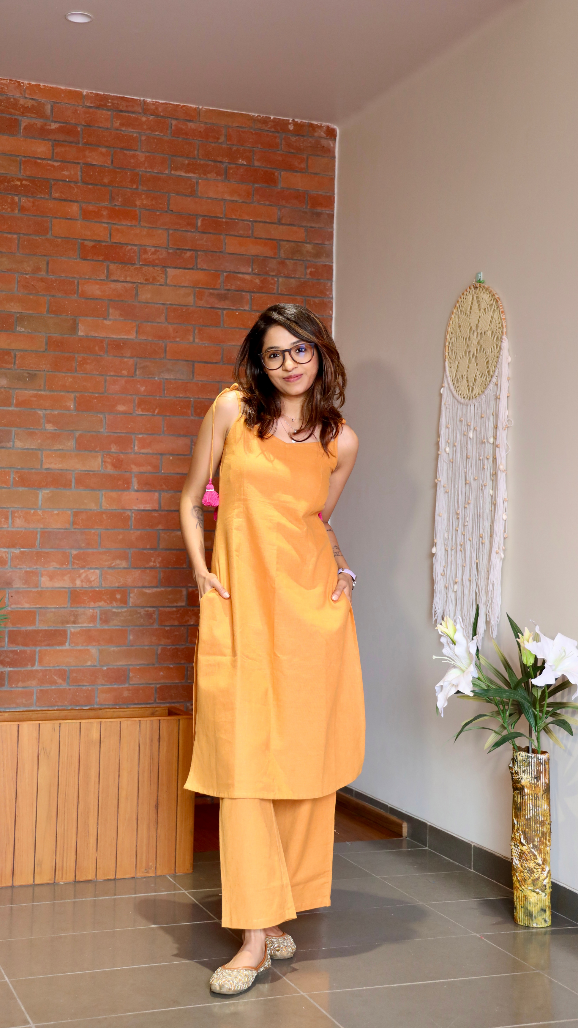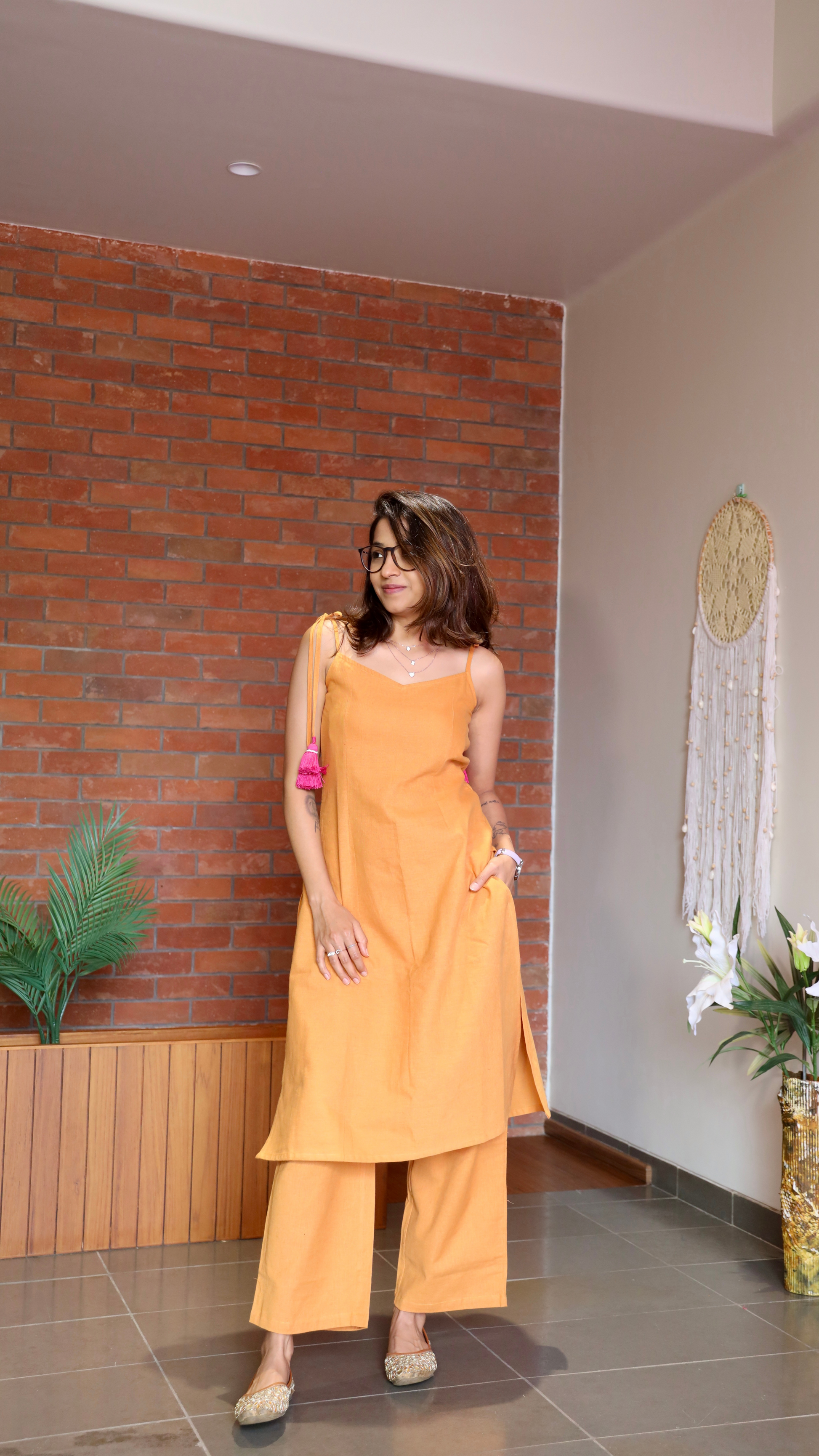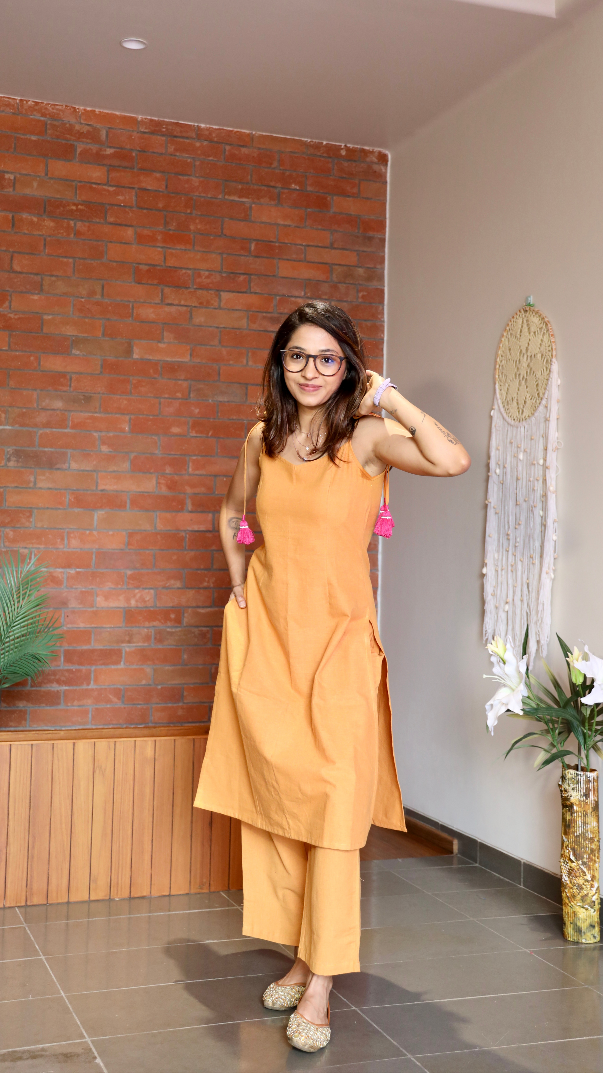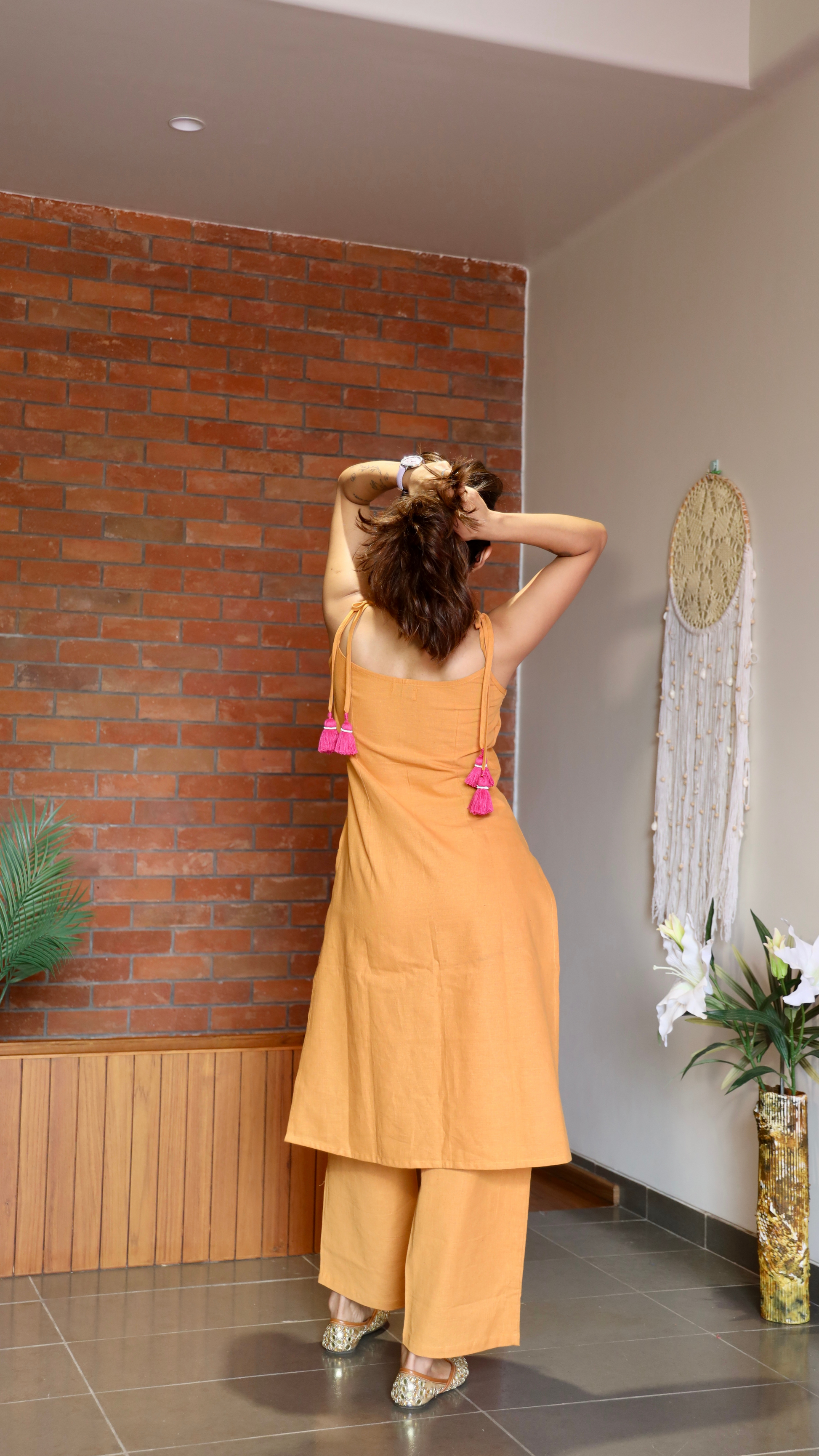 Soft like golden hour and warm like a memory, the Tangerine Dream Co-ord Set is your wearable dose of sunshine. With a sun-kissed tan-orange hue and tassel-tied straps, this set feels like slow mornings, desert skies, and being exactly where you’re meant to be. It’s made for movement and ease — a blend of earthy calm and quiet confidence.