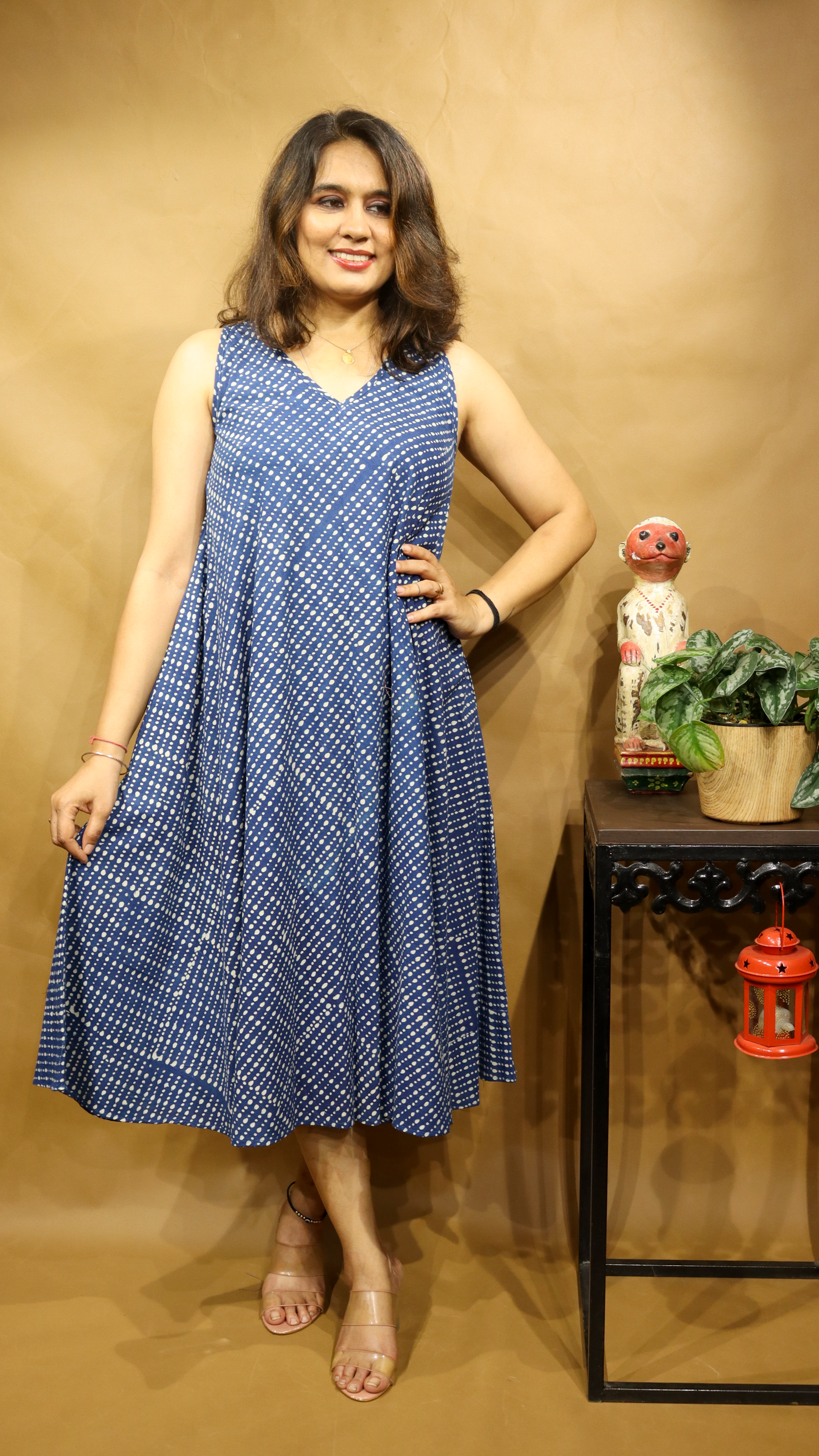 The Indigo Whispers Circular Dress brings together heritage artistry and everyday ease in a truly timeless silhouette. Made from 100% breathable cotton, this dress is adorned with diagonal dotted stripes in rich shades of indigo — a print that echoes the depth of oceans and the serenity of starry nights.