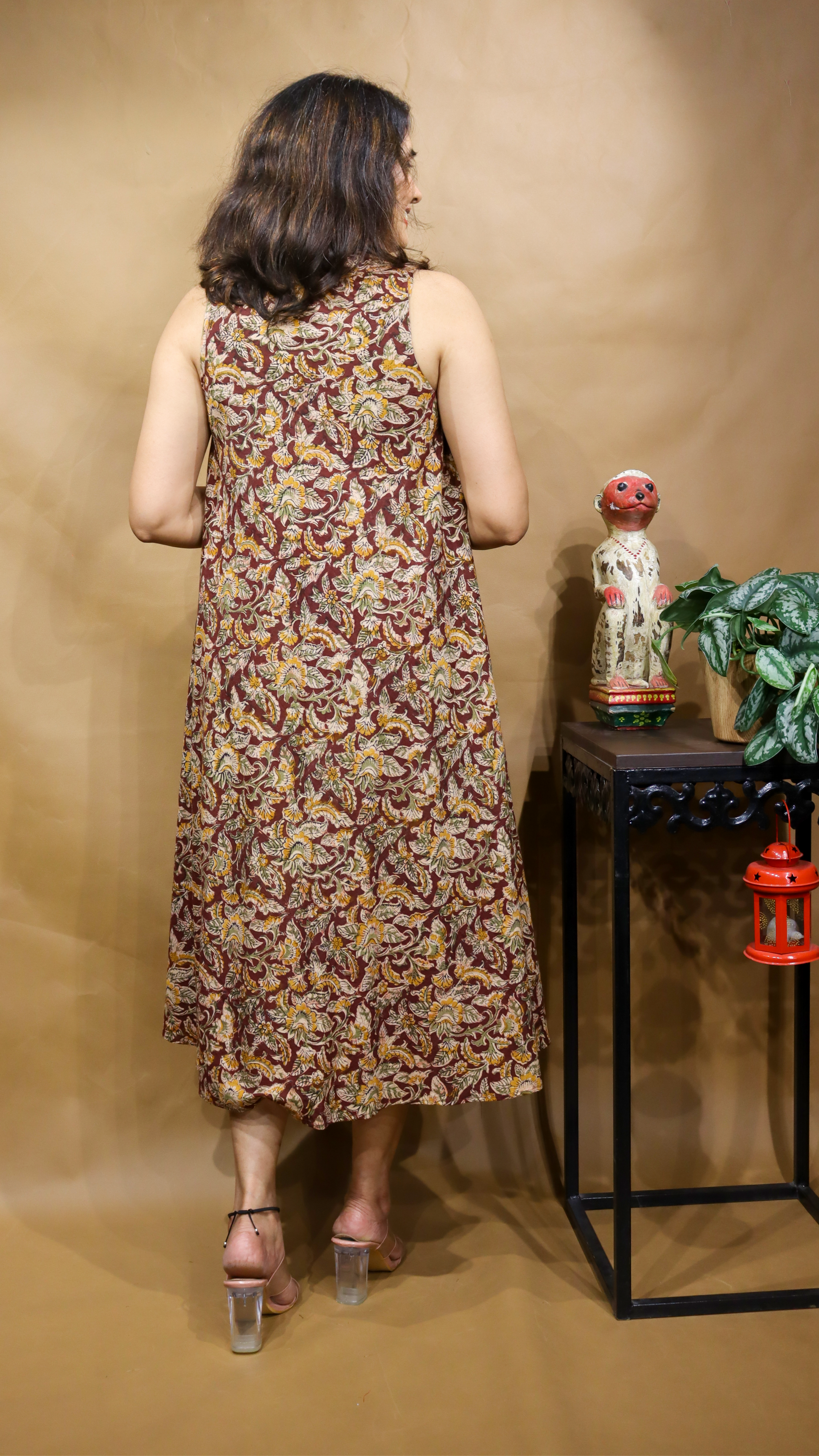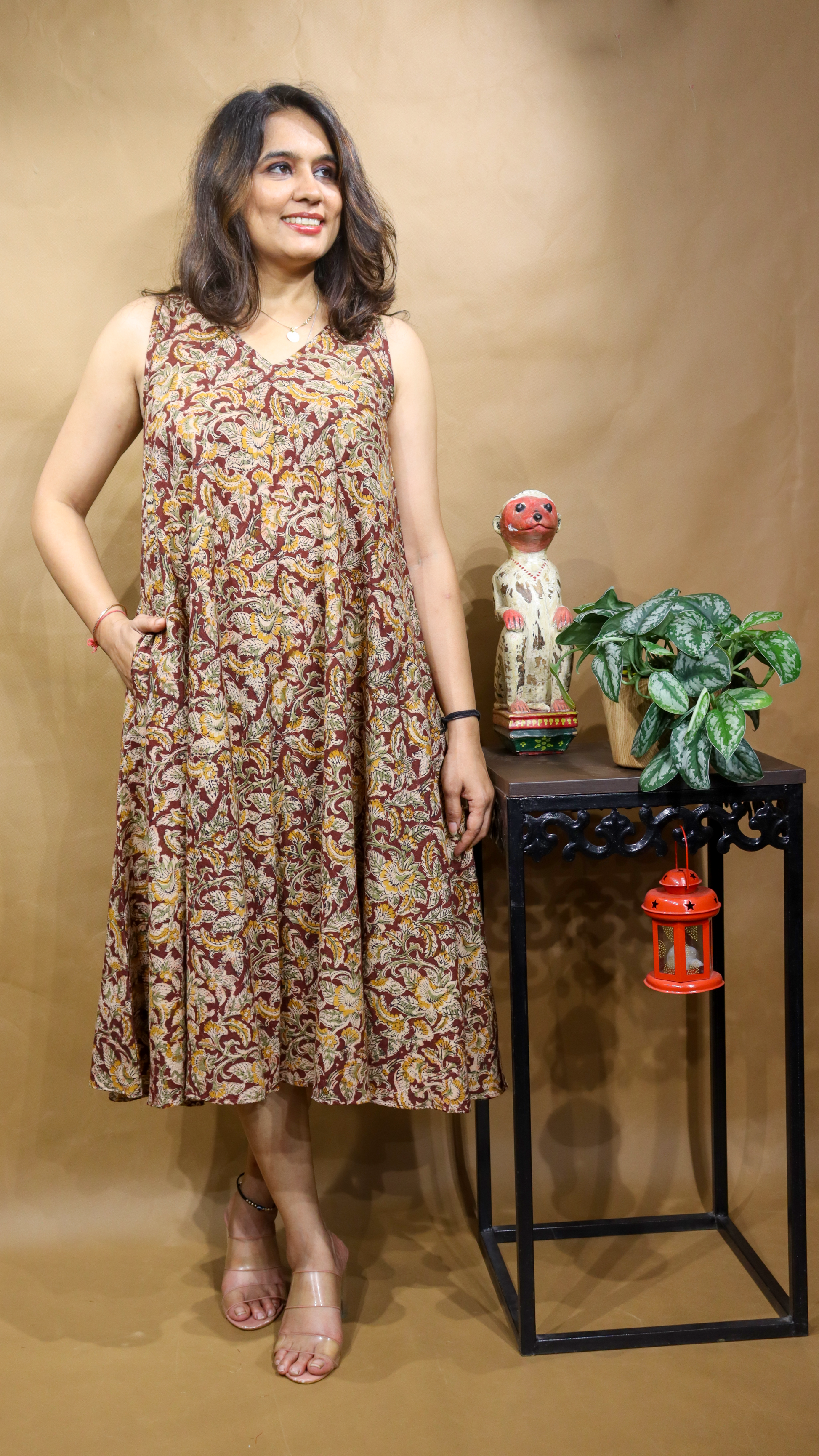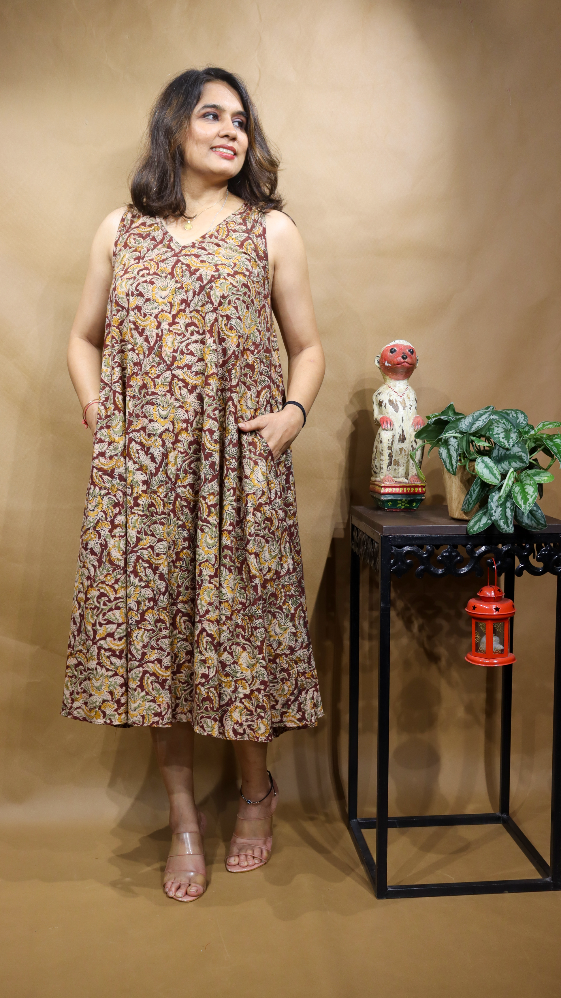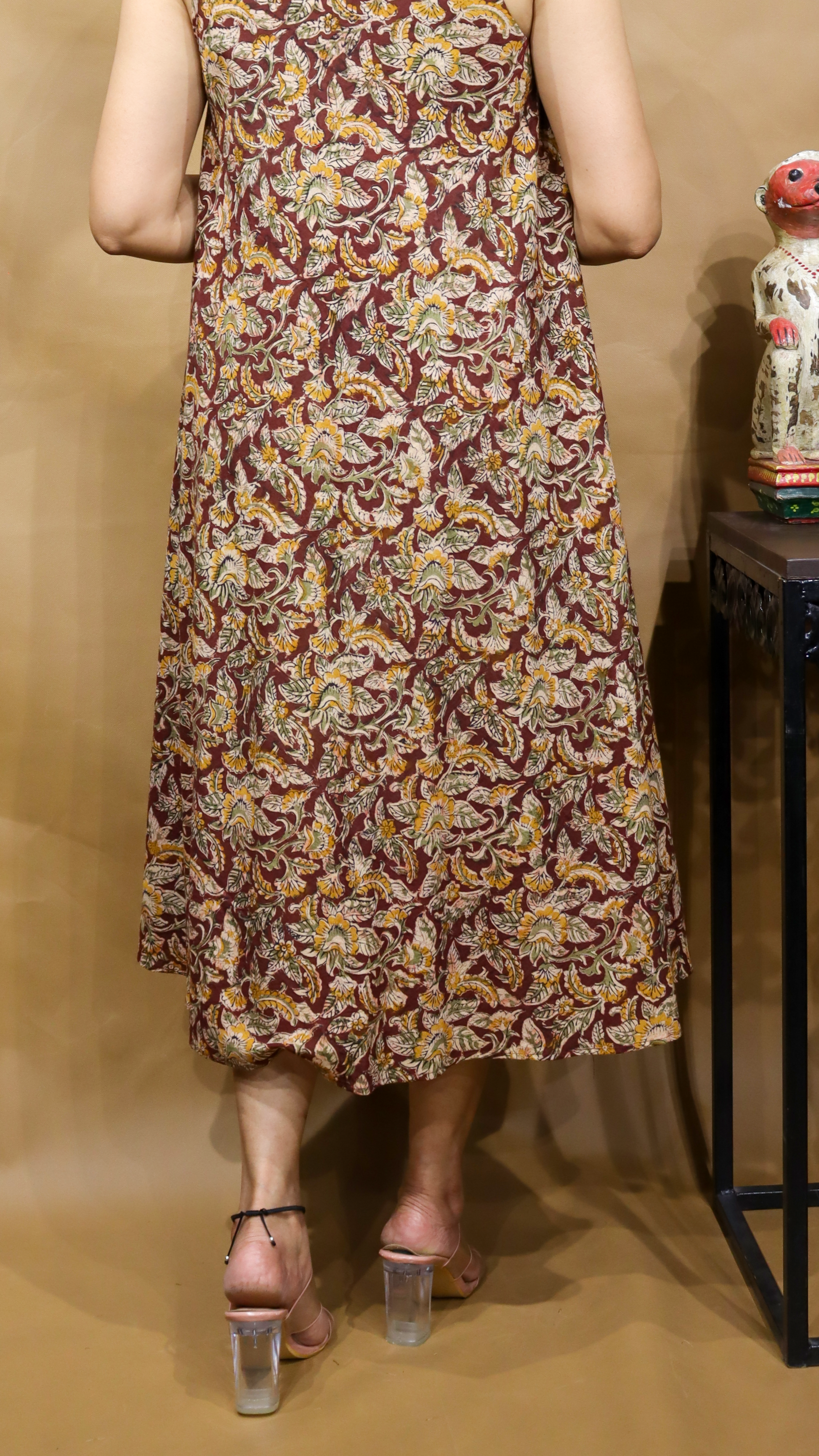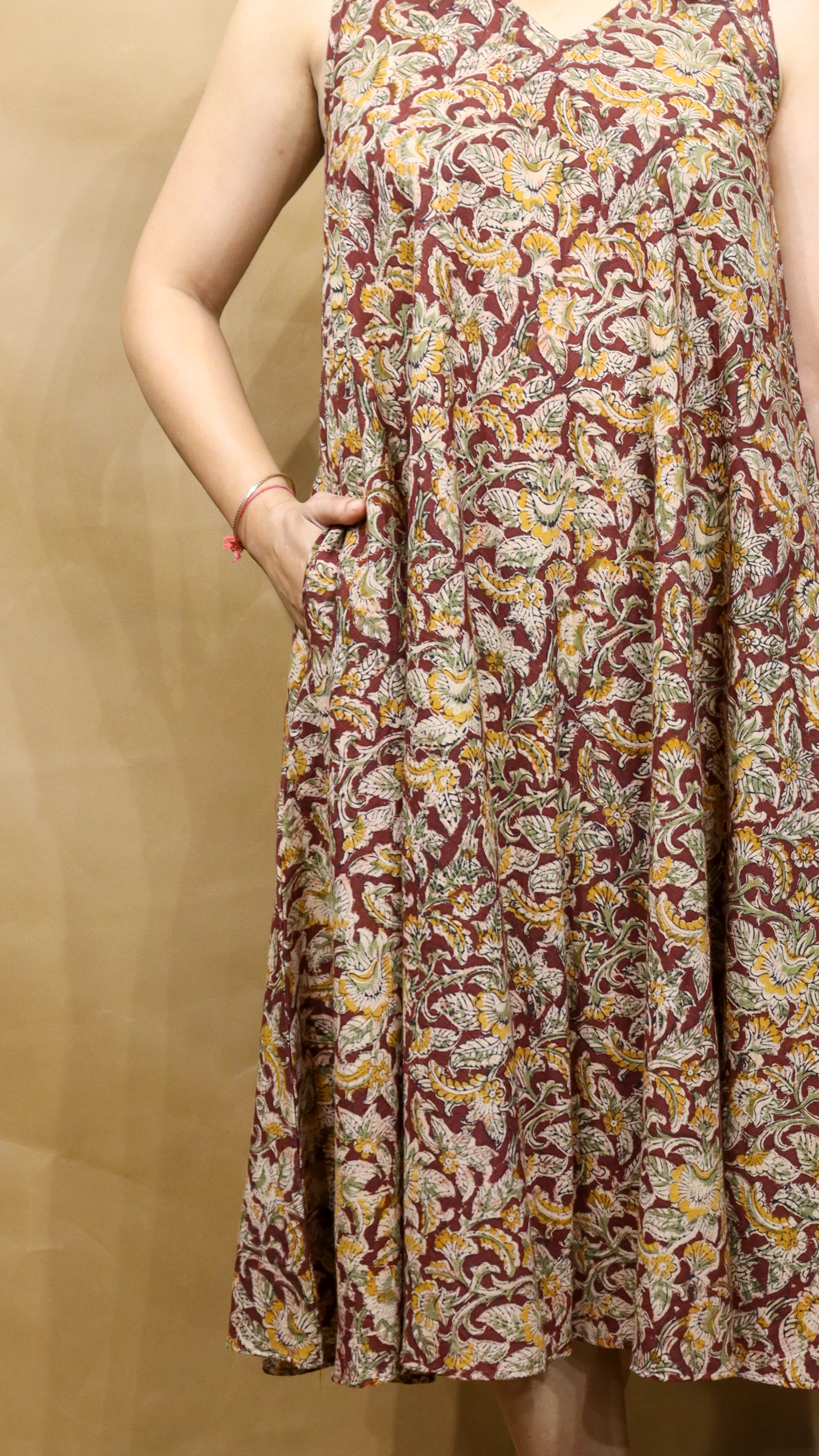 The Marigold Kalamkari Circular Dress radiates warmth and vibrance in every detail. Crafted from 100% breathable cotton, it features a mustard-yellow base brought to life with red and blue motifs inspired by timeless Indian block prints.