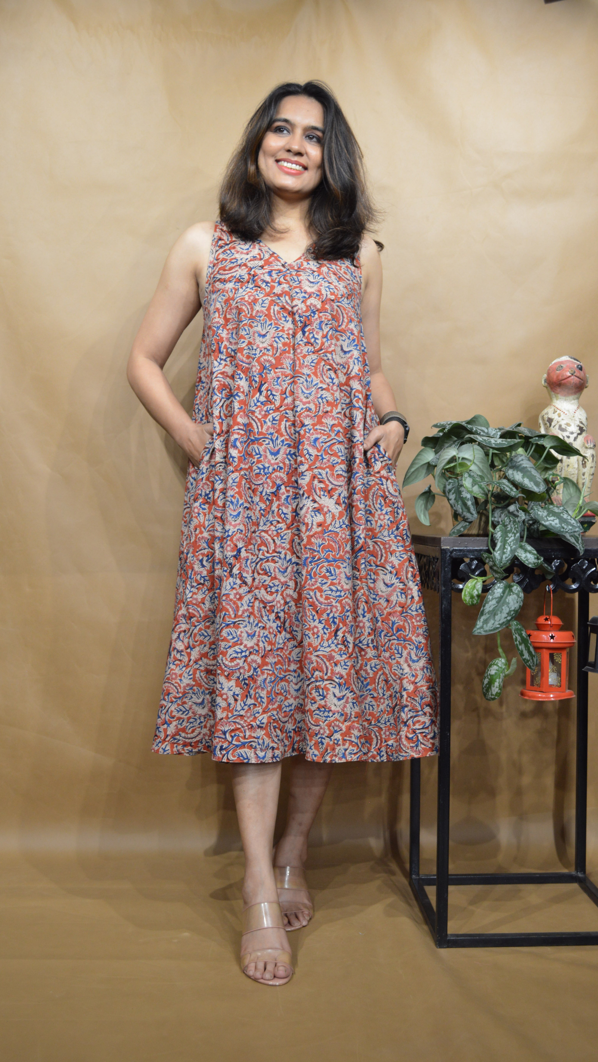 A reddish-pink cotton dress alive with floral Kalamkari detailing — rustic, romantic, and beautifully timeless.