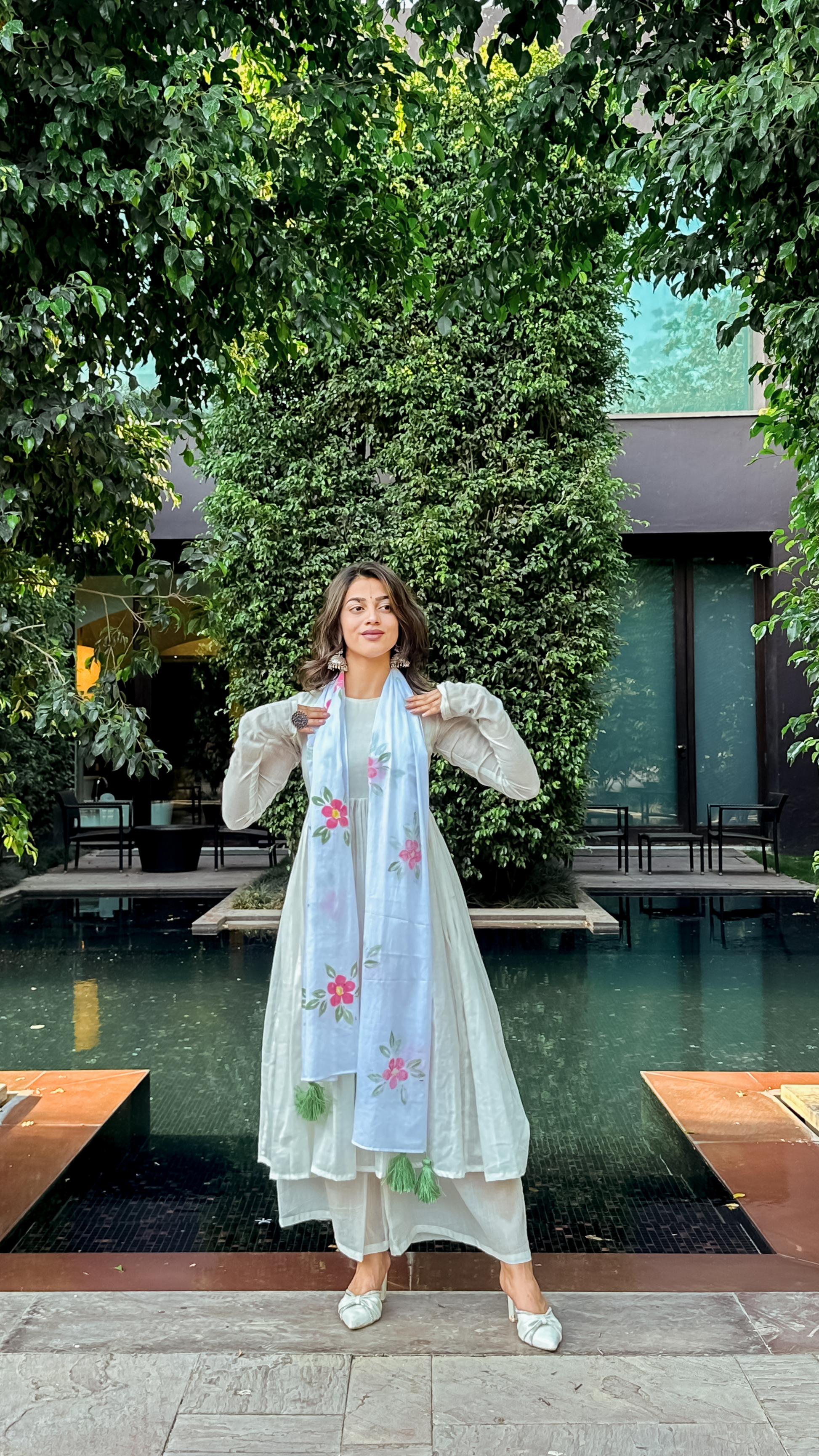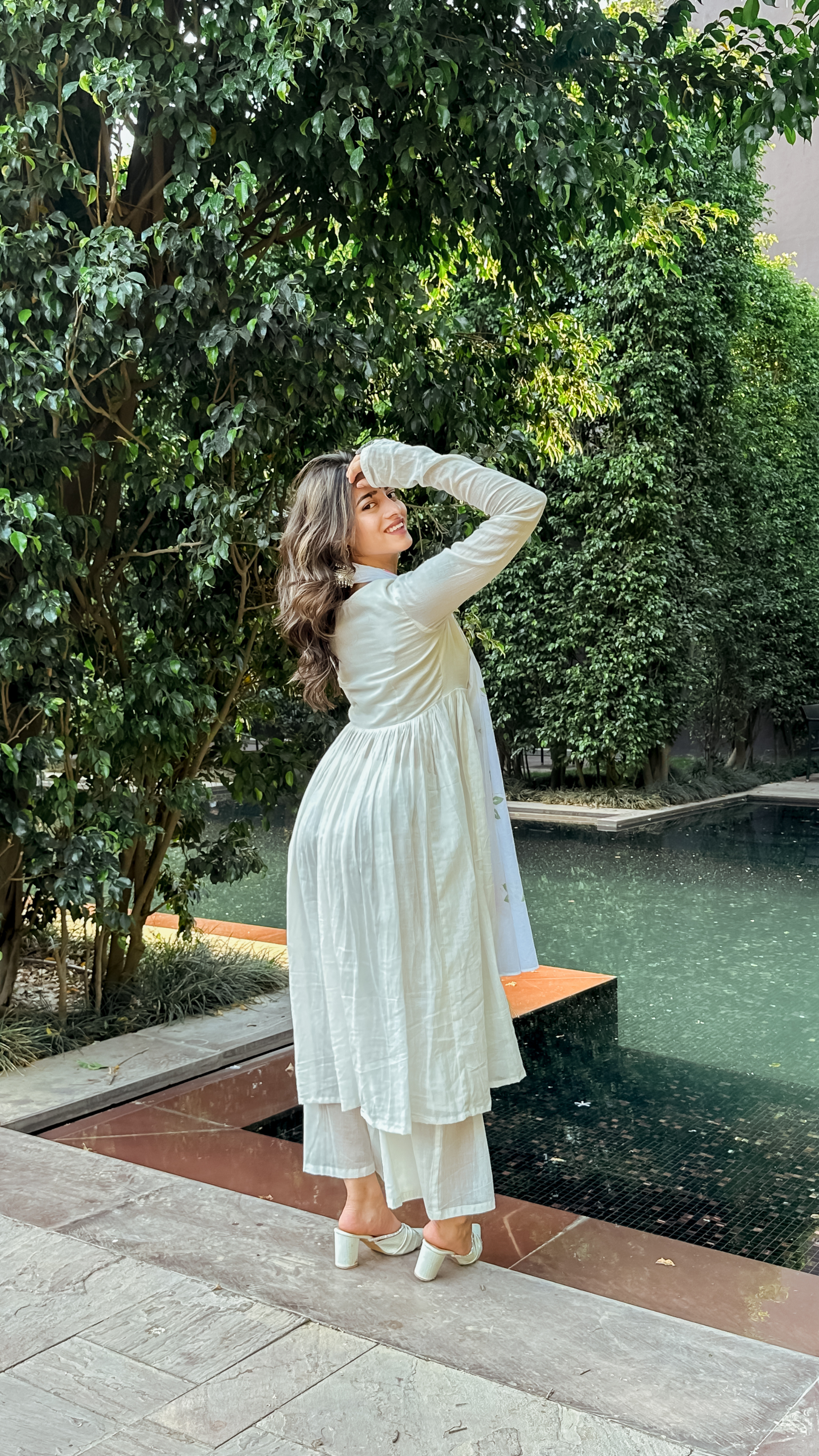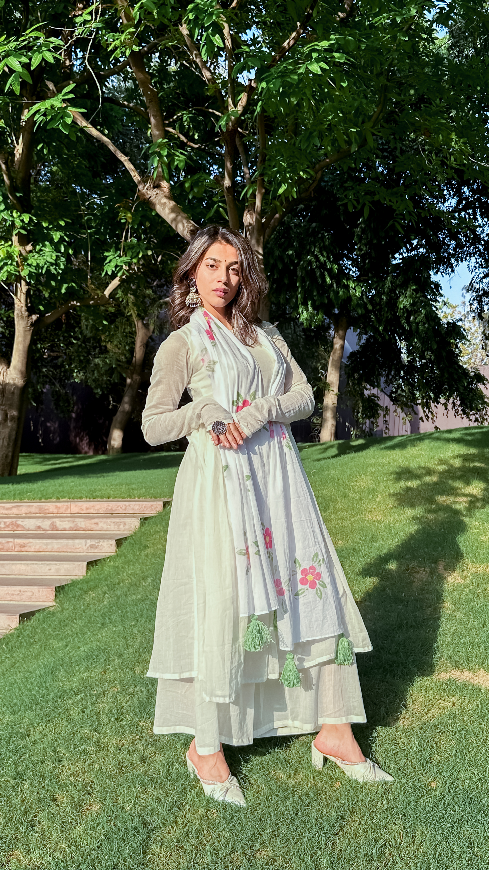 "Indulge in timeless elegance with our exquisite Angrakha set, meticulously tailored for summer weddings or intimate gatherings. Crafted from luxurious pure MUL cotton fabric, this ensemble exudes grace and sophistication. The Angrakha top features chic churidar sleeves, while the flared palazzo adds a touch of modern flair. Radiate charm and poise on any occasion with this stunning ensemble, perfect for making a memorable statement."