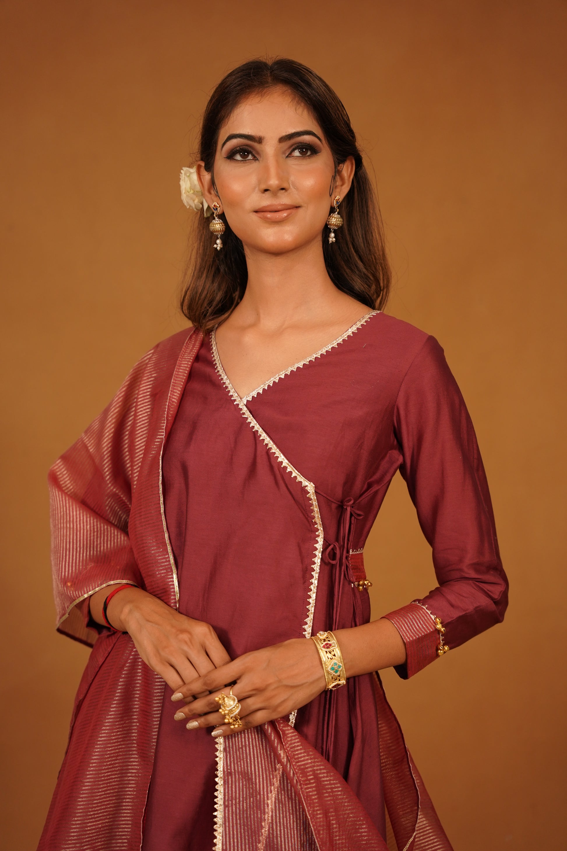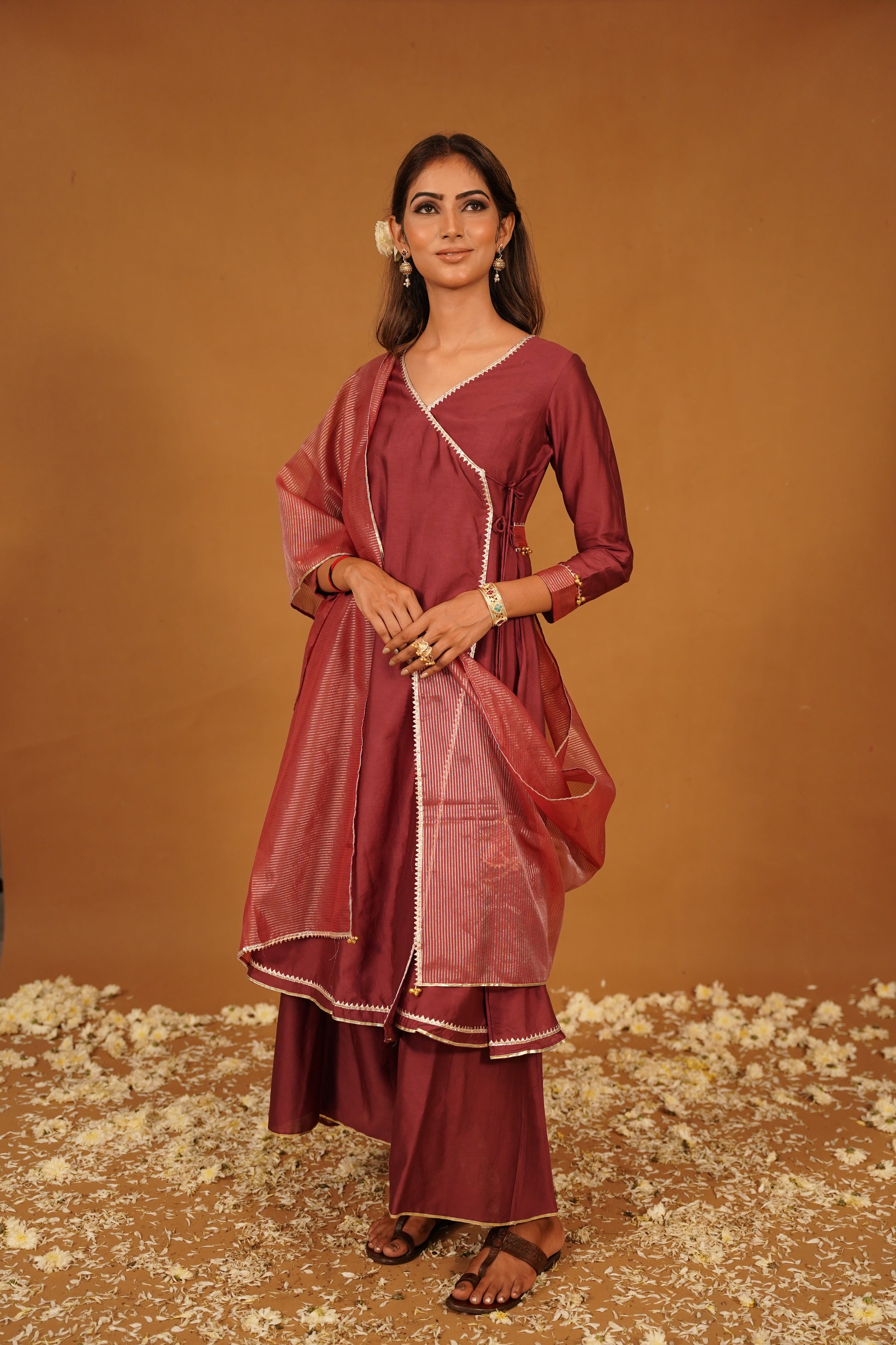 This wine Chanderi Aangrakha set is more than just clothing; it’s a celebration of craftsmanship and style. Perfect for weddings, festivals, or any special event, this ensemble will ensure you turn heads and make a lasting impression. Embrace your elegance and heritage with this exquisite Aangrakha set that promises to be a timeless addition to your wardrobe.