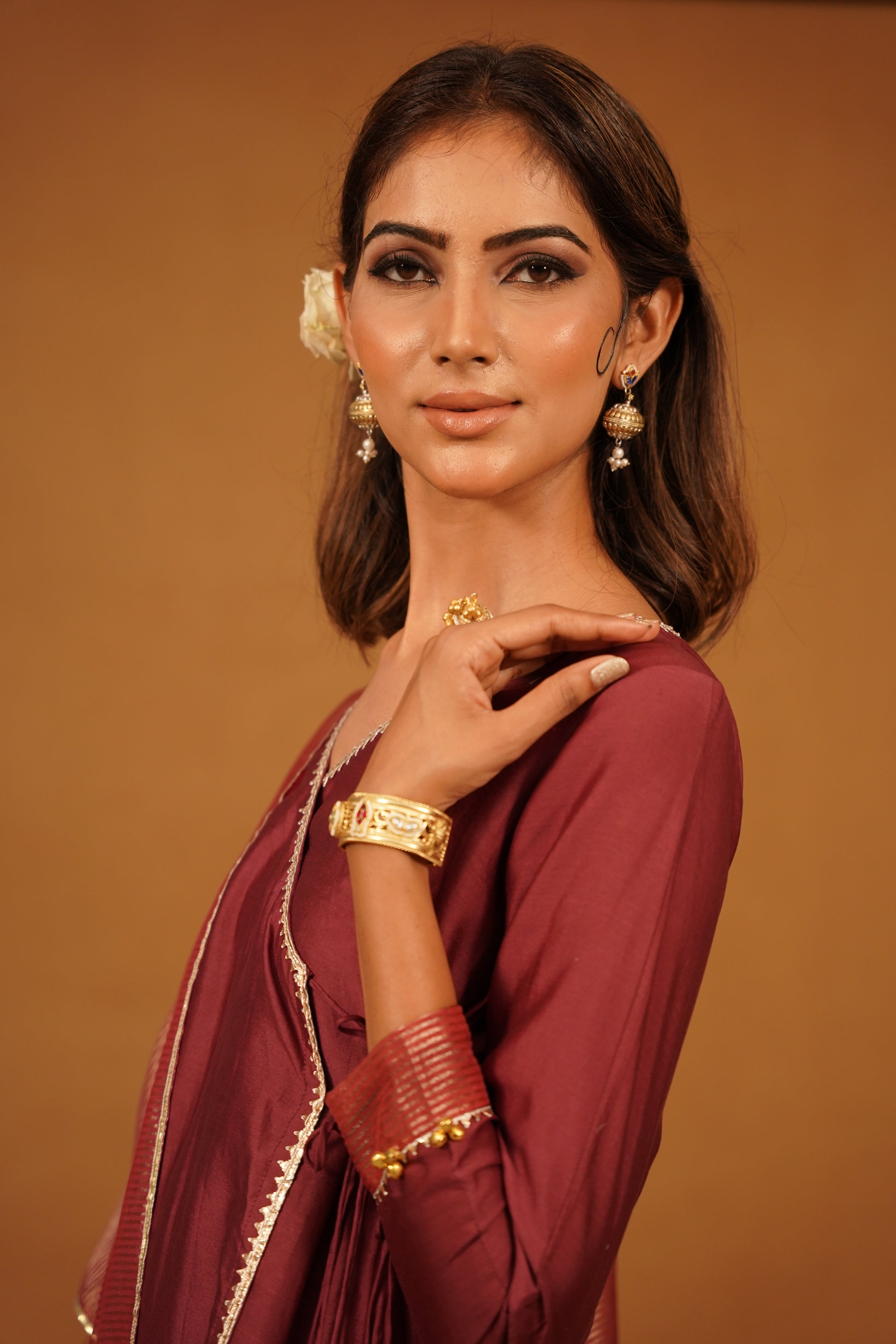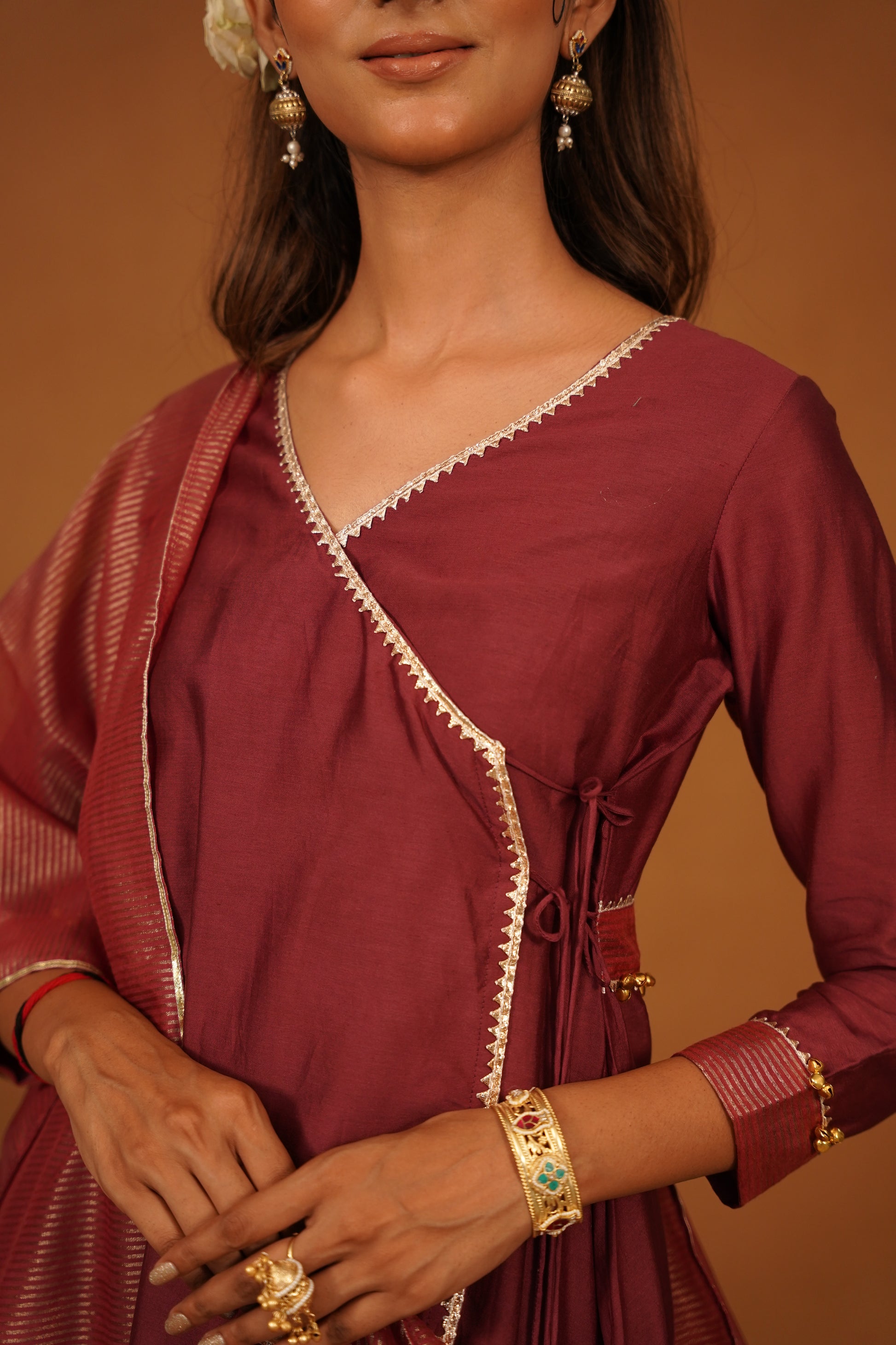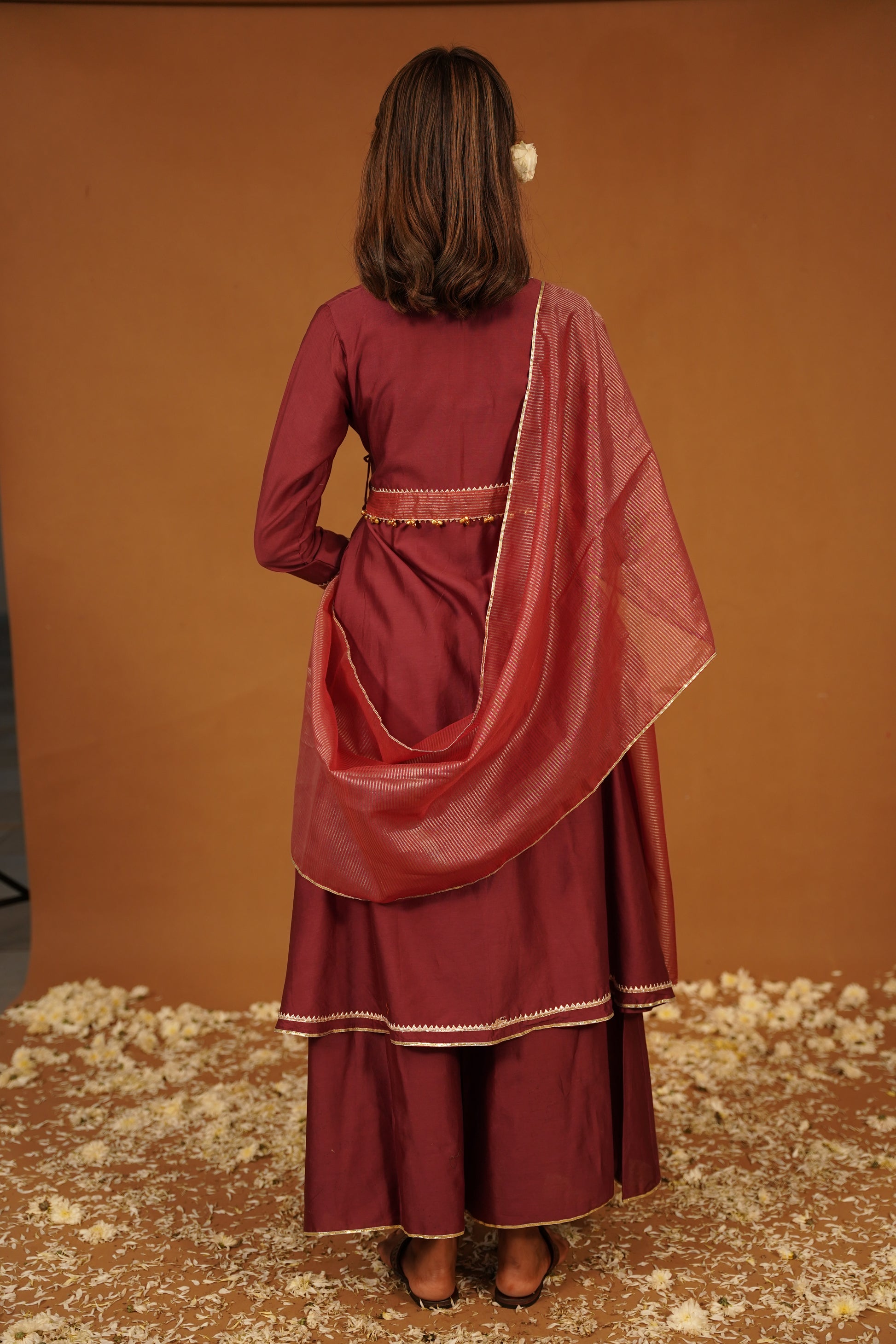 The rich wine color exudes sophistication, providing a striking backdrop for the intricate detailing that defines this ensemble. The Aangrakha features a flattering silhouette with a unique wrap design, enhanced by exquisite gota and ghugari work at the back. This attention to detail not only adds visual interest but also infuses the piece with a sense of traditional charm, making it a standout choice for any occasion.